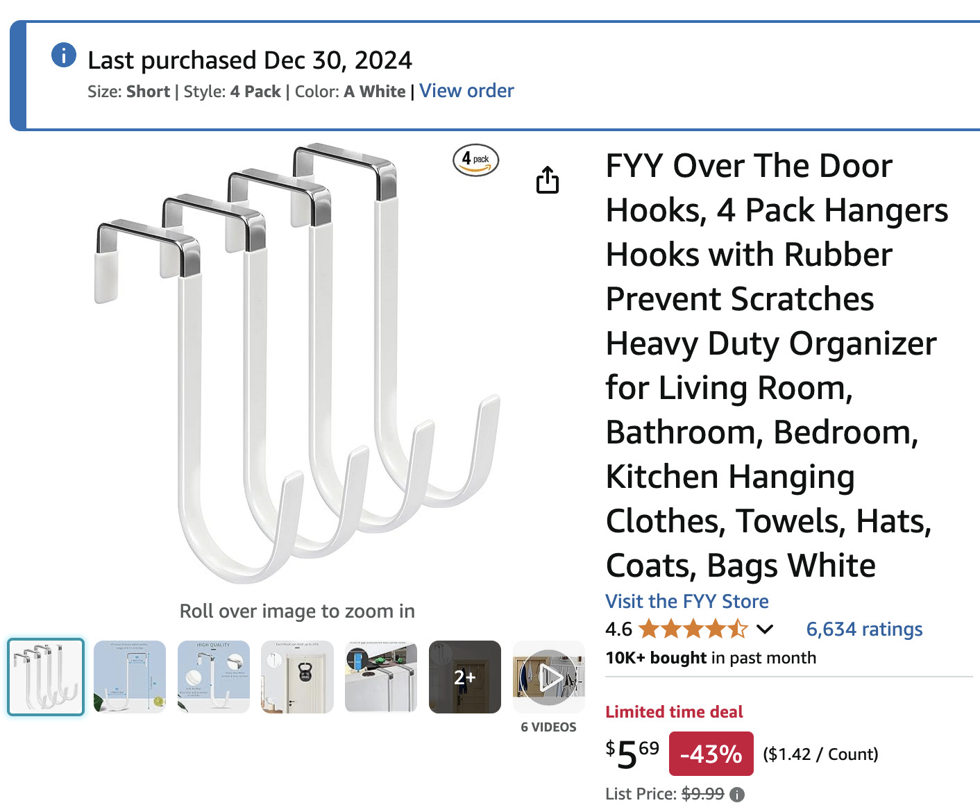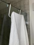 Aus diesem Grund habe ich mir bei Amazon ein Vierer-Set Haken gekauft, die man über Türen oder sonstige vertikal aufgestellte Wände hängen kann und die ihrerseits auf der Vorderseite einen Haken bieten, der zum Aufhängen eines Kleidungsstücks oder Handtuchs einlädt. Das Set reist mit uns mit und flugs wird jede ungemütliche Mietwohnung zu einem neuen Zuhause.