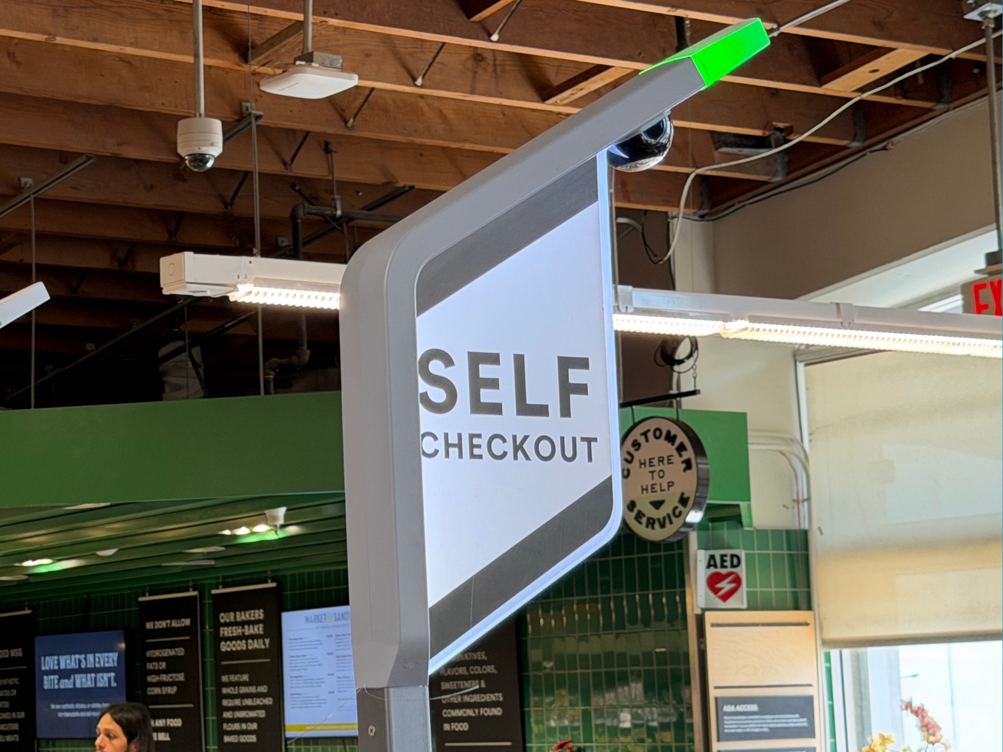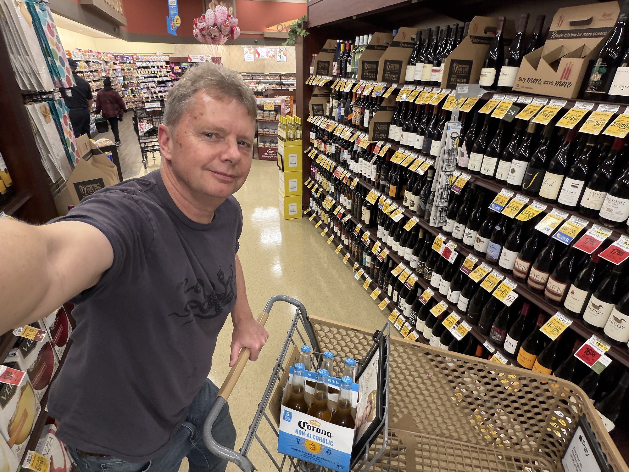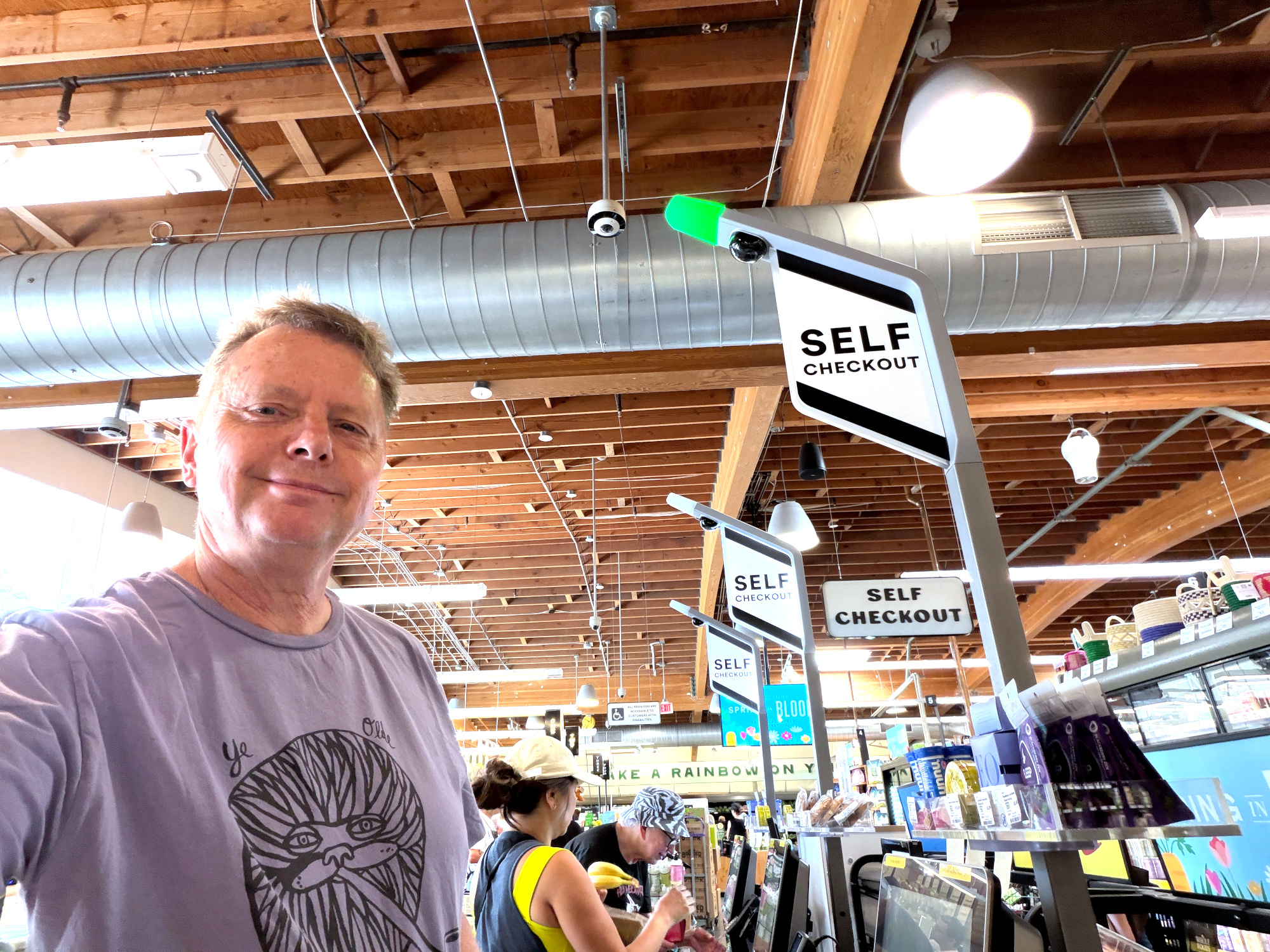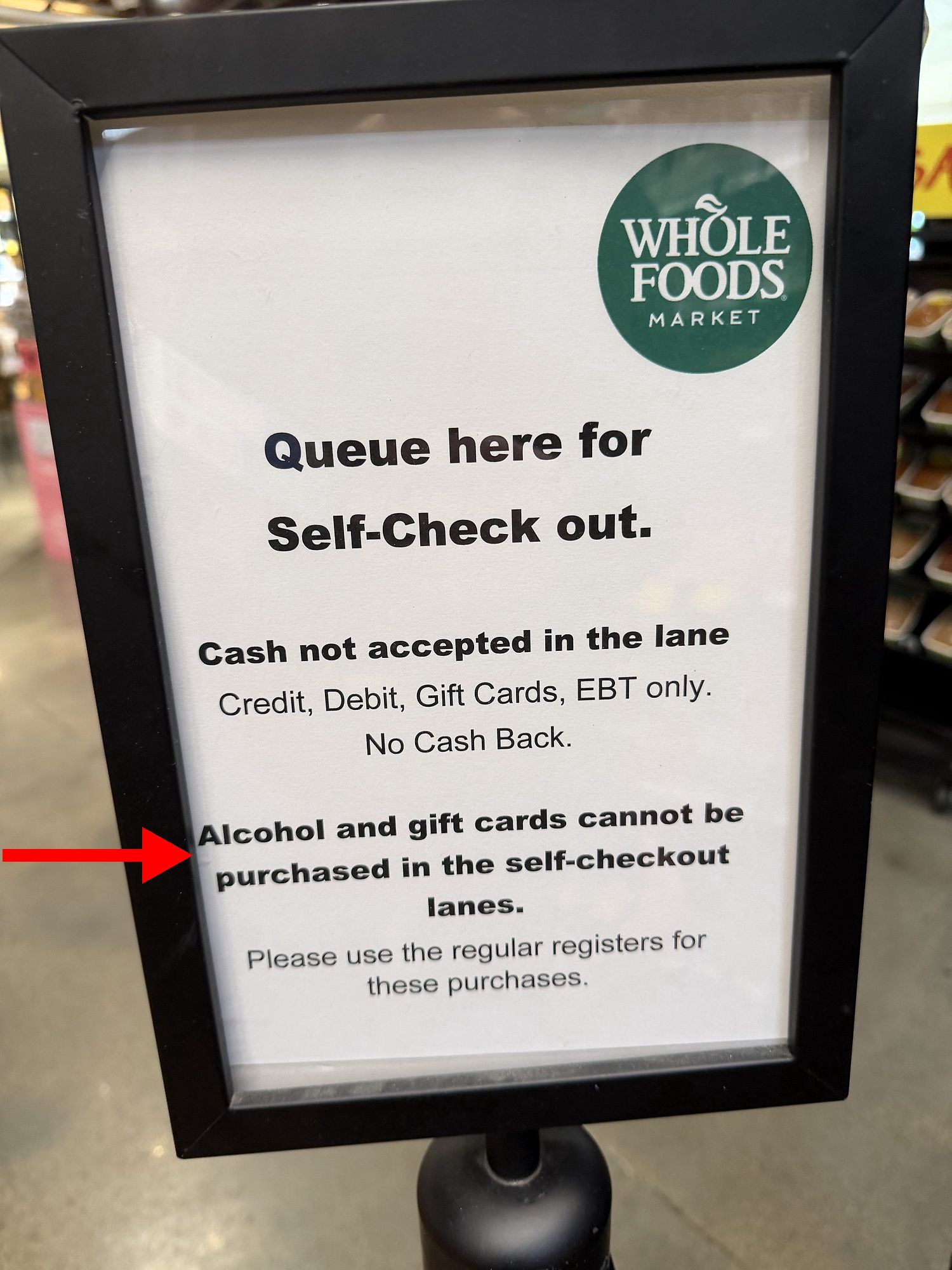 Michael Ihr seid als Rundbriefleser ja alle enorm gebildet und wisst bestimmt, dass man in den gesamten USA unter 21 keine alkoholhaltigen Getränke kaufen kann. Und da selbst alkoholfreies Bier normalerweise Spuren von Alkohol enthält, gibt's auch das nicht für die jungen Hüpfer. Wie ist das aber an den heutzutage allgegenwärtigen Selbstbedienungskassen im Supermarkt? Bei unserem Whole Foods um die Ecke steht zum Beispiel vor den Scannern ein Schild (Abbildung 4) mit dem Text, dass man mit Alkohol im Wagen rüber zur normalen bemannten Kasse muss. Und dass das auch bei alkoholfreiem Bier gilt, habe ich persönlich schon einmal ausprobiert. Das Selbstbedienungsgerät sperrte sich, und ein Mitarbeiter kam angelaufen, um mich zur bedienten Kasse zu dirigieren.