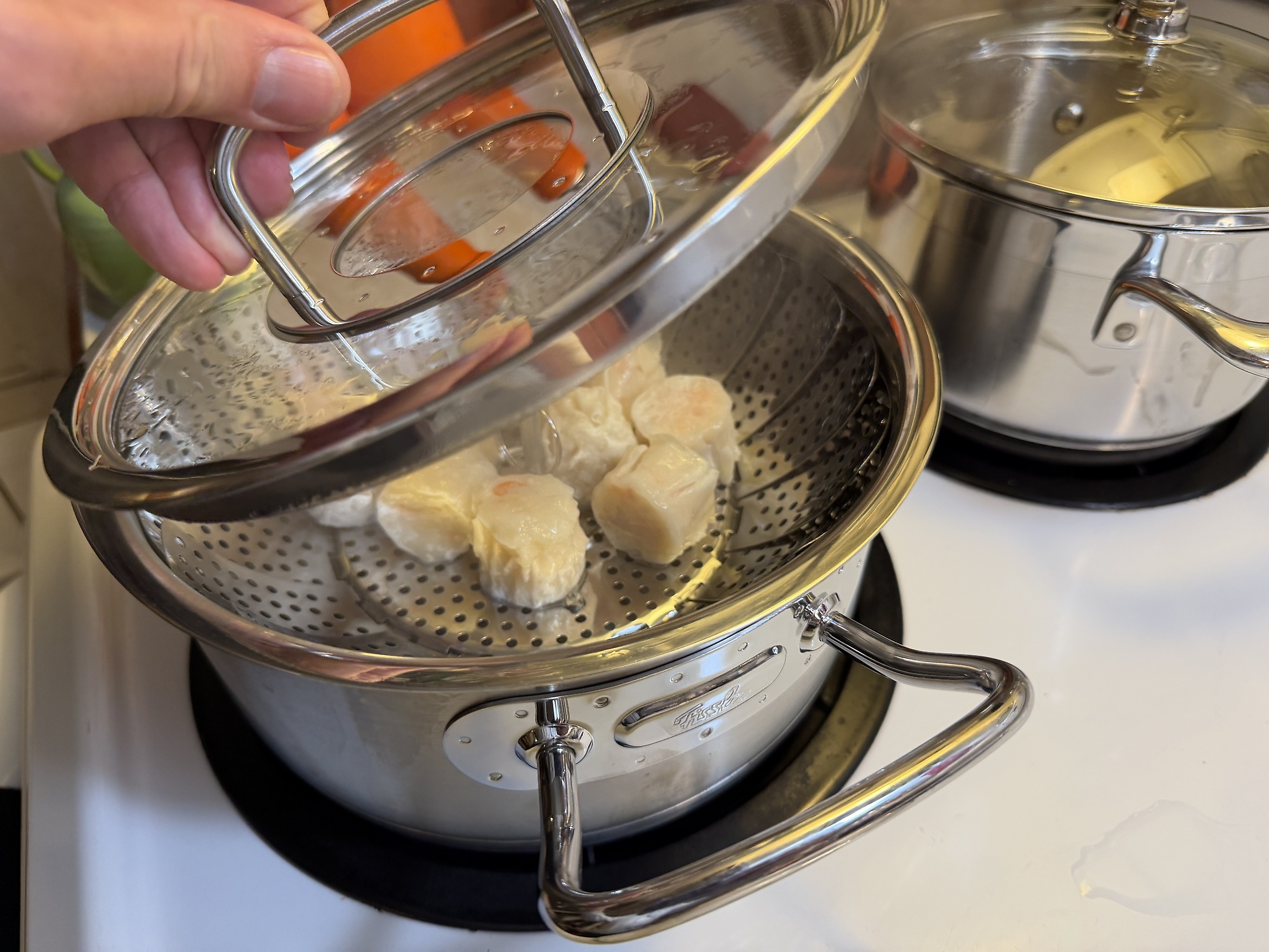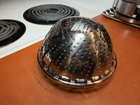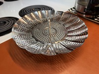 Michael Meine Kochkünste nehmen ja mittlerweile furcheinflößende Formen an, aber bislang hatte ich mir wegen Platzmangels noch keinen Topf zum Dämpfen gekauft. Angelika musste sogar mal für Kartoffelklöße zum Entenbraten eine abenteuerliche Konstruktion aus einem über den Topf gespannten Küchenhandtuch mit Glasglocke aufbauen.