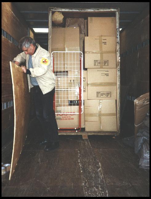Abbildung [8]: Die Umzugskiste wird eingeladen. Zwei Monate später wird sie in San Francisco auftauchen. Das Unternehmen Forster in München können wir nur empfehlen, die sind Weltklasse.