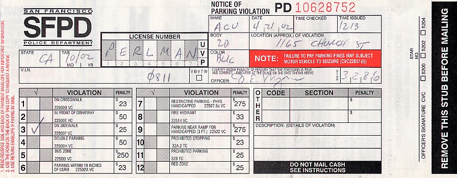 Michael In den letzten paar Jahren hat San Francisco die Strafen für Falschparken kräftig angehoben. Wie ihr in Abbildung 1 sehen könnt, kostete es im Jahre 2002 noch lumpige $25, als ich unser altes Auto PERLMAN einmal eine Stunde auf dem Gehsteig geparkt habe, weil vor unserem Haus kein Parkplatz frei war. Nach der neuen Strafzettelverordnung aus dem Jahr 2013 kostet es den Autofahrer heute sage und schreibe $110!