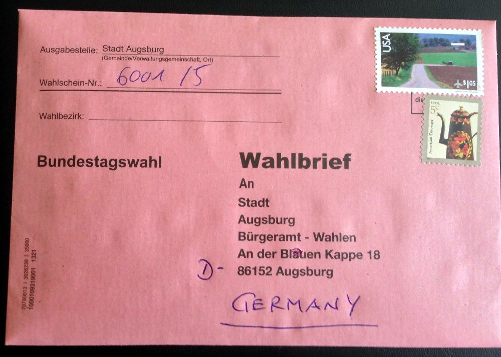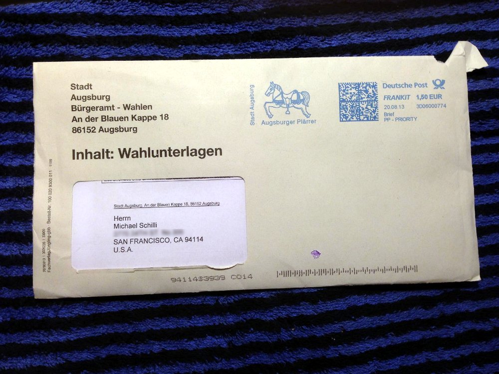 Wie gut, dass ich immer alles aufhebe und abhefte. Dann mussten wir natürlich noch versichern, dass wir schon 18 und somit wahlberechtigt sind und die oben genannten Bedingungen erfüllen, um als Deutsche im Ausland wählen zu dürfen. Dann schickten wir unsere Anträge an das Wahlamt unseres letzten Wohnsitzes, was bei mir München war, und bei Michael lustigerweise Augsburg. Stichtag für den Eingang des Antrags war dieses Jahr übrigens schon der 2. September, denn das Ganze muss schließlich bearbeitet werden. Wir hatten schon Bedenken, ob irgend jemand unsere Anträge überhaupt ernst nehmen würde, aber deutsche Amtsstuben arbeiten nach wie vor wie die Uhrwerke, denn zu unserem Erstaunen kamen von beiden Wahlämtern nach einigen Wochen richtig frankierte und adressierte Umschläge mit den Wahlunterlagen in San Francisco an!