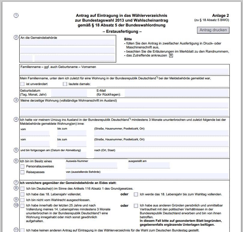 Nun ja, 25 Jahre sind wir ja dann doch noch nicht hier, also haben wir heuer per Briefwahl gewählt. Ich hatte schon einmal berichtet, dass wir nicht etwa einfach die Briefwahlunterlagen beim deutschen Konsulat in San Francisco abholen können (Rundbrief 09/2002). Nein, nach den Wahlinformationen für Auslandsdeutsche mussten wir zunächst einen Antrag zur Aufnahme ins Wählerregister stellen. Dazu lädt man einfach von obiger Webseite den Antrag als PDF-Dokument herunter. Neben dem Namen, Geburtsdatum, der Passnummer und der aktuellen Adresse im Ausland musste auch die Adresse drauf, unter der wir zuletzt in Deutschland gemeldet waren, mit dem Abmeldedatum.