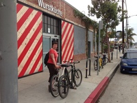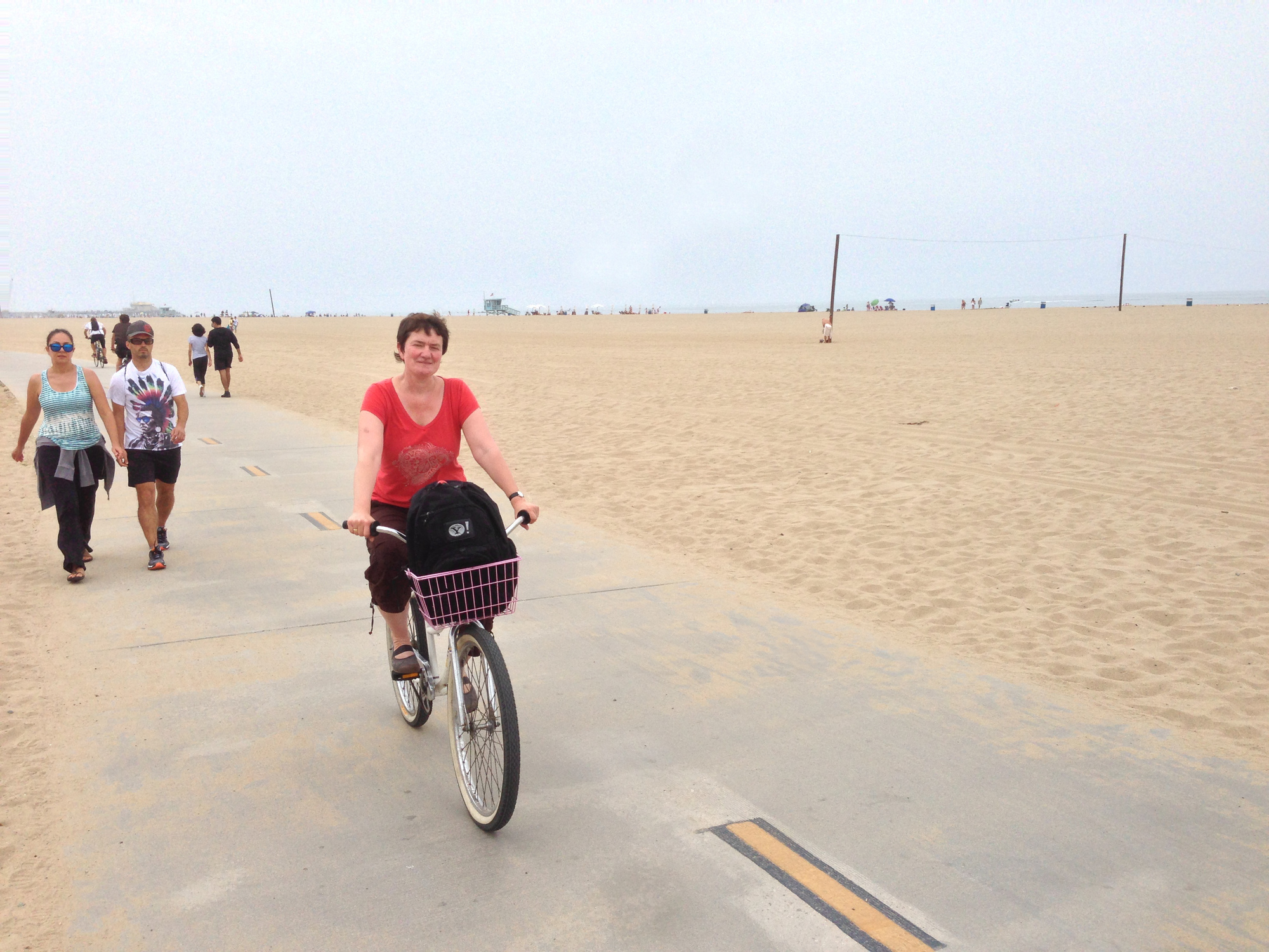 Wir fühlen uns zum Beispiel in "Venice" sehr wohl. Diese Gegend von L.A. kennt ihr vielleicht wegen dem "Muscle Beach", an dem bekanntlich schon Arnold Schwarzenegger in den Achziger-Jahren seine Muskeln in dem öffenlichen Freiluft-Fitnesscenter am Strand stärkte. Heutzutage stemmt dort kaum noch jemand Hanteln, aber wir haben uns Fahrräder gemietet und sind am breiten Sandstrand entlang fast bis hoch nach Malibu gefahren. In Abbildung 2 seht ihr Angelika mit einem sogenannten Cruiser-Fahrrad, einer Art Hollandfietze mit extra breitem Sattel und bequem montierten Lenker zum langsamen Entlangdüsen an der Strandpromenade. Hat schlappe $20 pro Tag und Fahrrad gekostet. Zum Vergleich: Mietautos in Los Angeles kriegt man ebenfalls oft schon für $20 am Tag! Im Korb von Angelikas Fahrrad in Abbildung 2 liegt übrigens, wenn ihr das Bild vergrößert und genau hinseht, ein Rucksack mit einem unauffälligen "Y!"-Logo. Das ist, sagt's nicht weiter, das geheime Erkennungszeichen eines Yahoo-Mitarbeiters. Neulich hat uns in Las Vegas jemand deswegen im Hotelaufzug angesprochen.
