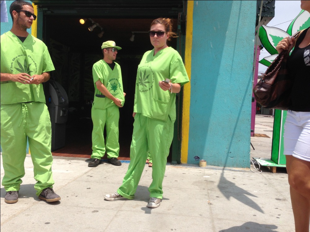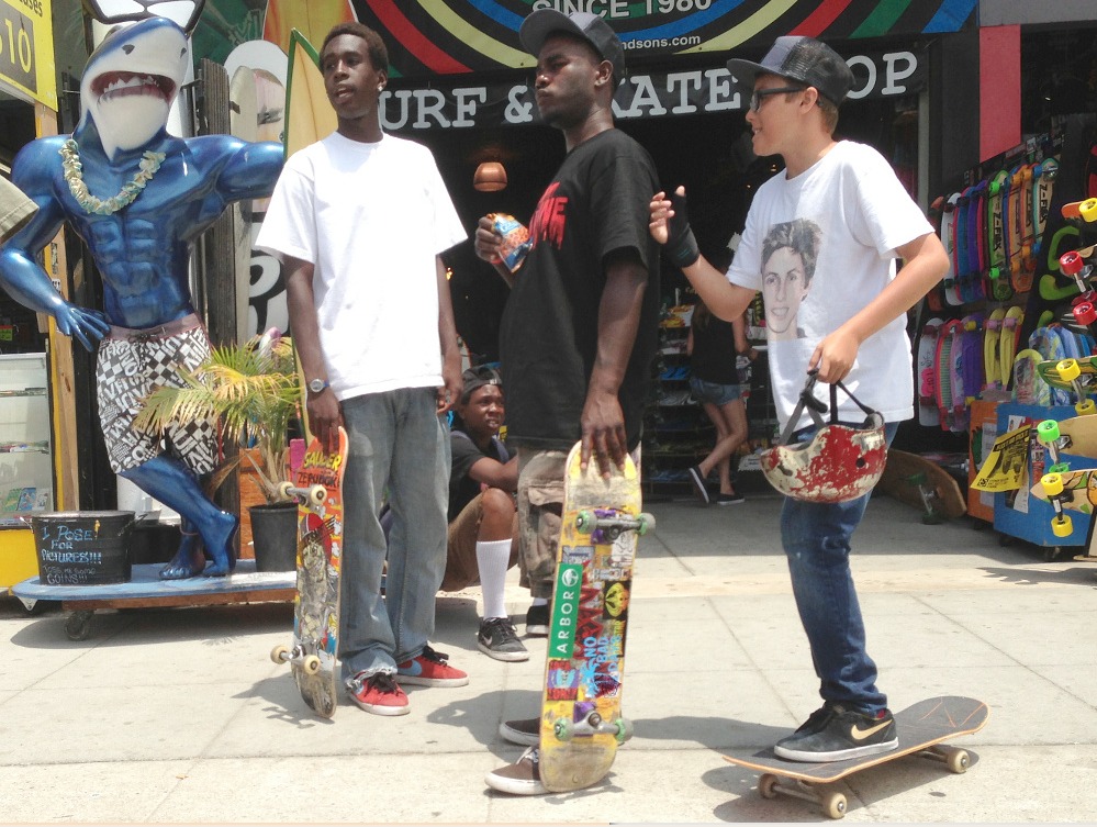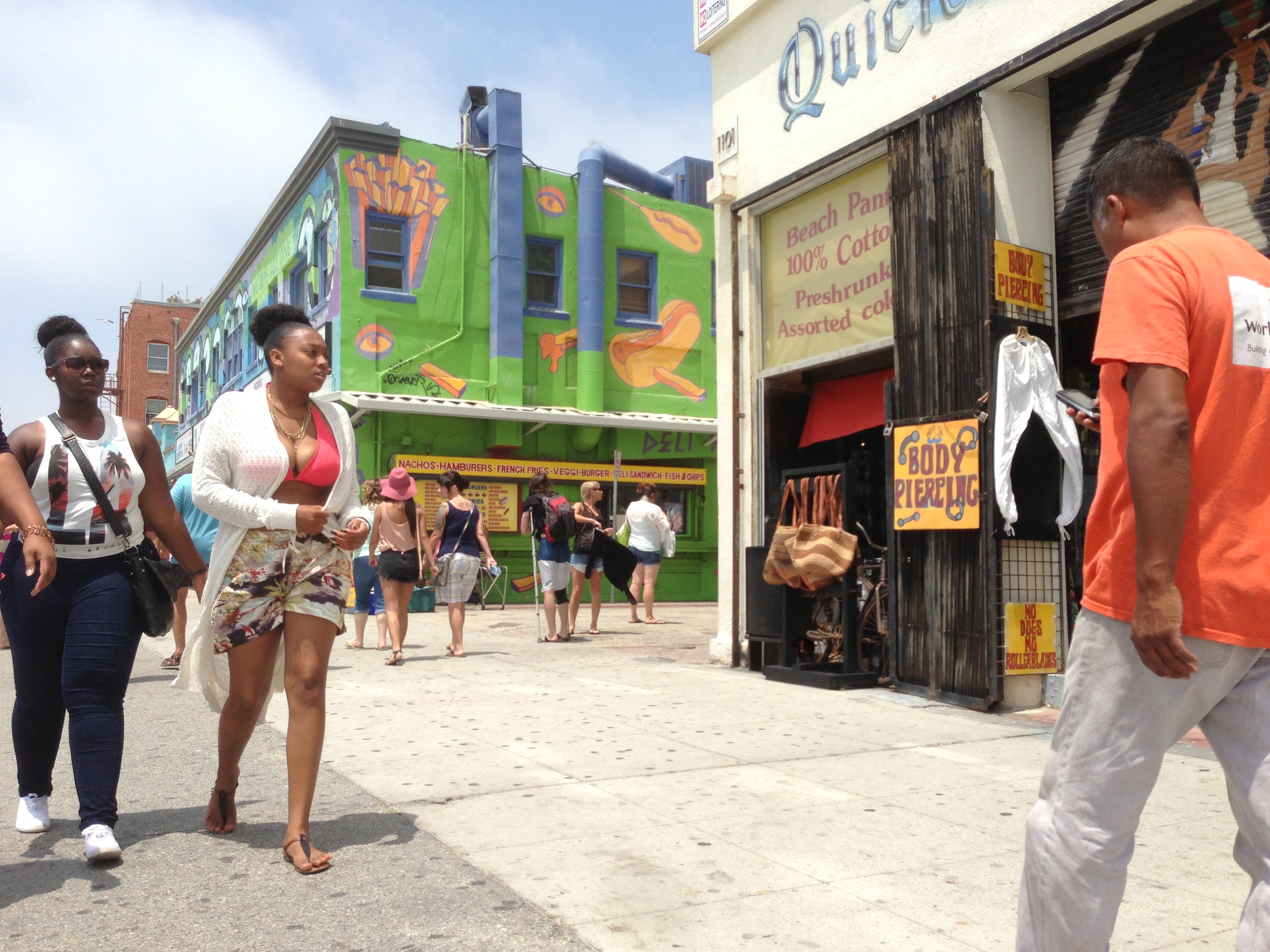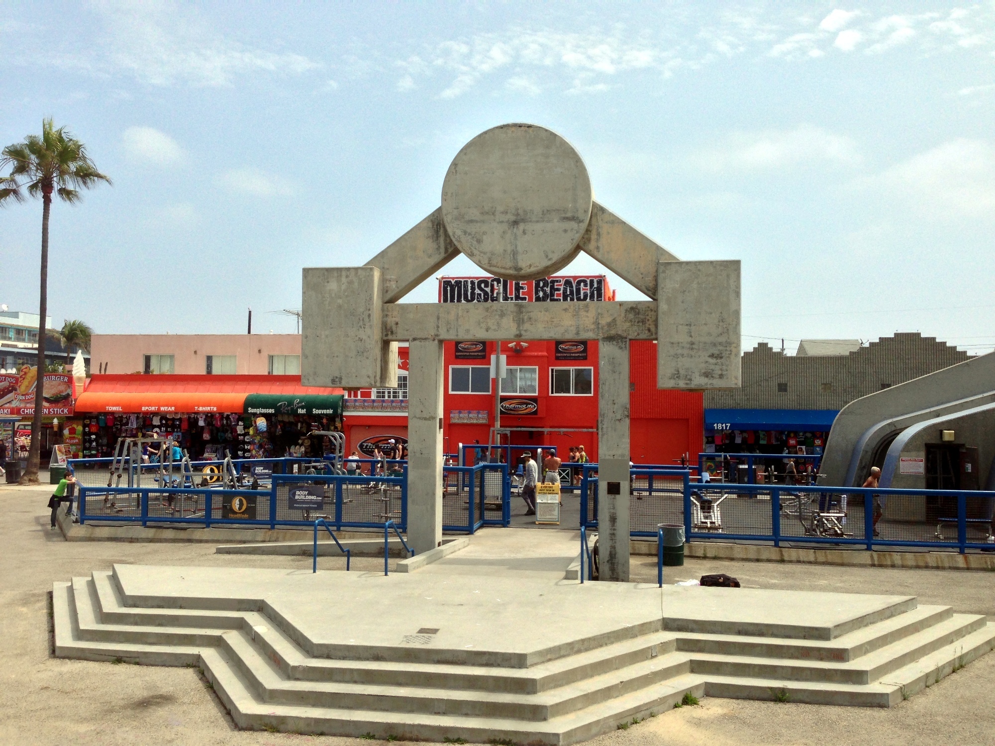 Die Strandpromenade ist heutzutage eine interessante Mischung aus Touristen, gestrandeten Existenzen, zwielichtigen Gestalten und Obdachlosen. Im Winter braucht ihr da nicht hinzufahren, aber im Sommer ist dort echt die Hölle los. Am Strand kann sich jeder, der eine Trommel besitzt, den Trommlern von Venice Beach anschließen und stundenlang heiße Rhythmen hämmern. Händler bieten allen möglichen Krimskrams vom Henna-Tattoo bis zu bemalten Totenköpfen feil, in den Läden an der Promenade steht ein breites Sortiment zum Verkauf, von Touri-Läden mit T-Shirts mit anzüglichen Aufdrucken, über Tätowier-Studios, oder Doktoren, die für $40 ein Rezept für medizinisches Marihuana ausstellen, bis zum Haschpfeiferlgeschäft ist da eigentlich alles dabei.