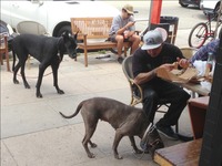 Das Ganze ist nicht immer ganz aufgeräumt, die nicht gerade für ihre Zimperlichkeit bekannte Bullerei von L.A. ist ständig präsent und schreitet hin und wieder ein wenn eine verkrachte Existenz durchdreht, aber alles läuft erstaunlich gewaltfrei ab. In den dunklen Gassen abseits der Promenade sollen angeblich öfter Leute ausgeraubt werden, allerdings sind wir noch nie auch nur in eine annähernd brenzlige Situation geraten. Gut, gut, hin und wieder muss man mal über einen verrückten Obdachlosen steigen, der sich quer auf den Gehweg hingelegt hat oder ein Irrer schreit irre rum, aber wir sind aus San Francisco ja einiges gewöhnt und machen uns da weiter keinen Kopf.