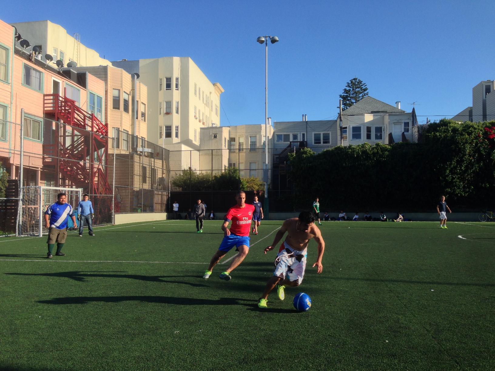Maintenance of all city soccer fields is the responsibility of the San Francisco "Recreation and Parks" department. Sure, there's grass fields in Golden Gate Park that are open for free play, but they often suffer from a lot of pot holes that put players at risk. For the nicely even artificial "astro turf" fields, however, the city wants residents to pay to play. Now, until a few years ago, there used to be a cement surfaced field at the corner of Valencia Street and 20th Street in the Mission neighborhood. Until late at night, this field was in heavy use, because its use was free of charge. Mostly residents of South American origin used to play there passionately, showing off the typical South American street soccer that's very fast, with a lot of dribblings and demonstration of mind-boggling tricks by individual players. Passing the ball is not valued as much and often players try to score instead, even if it's virtually impossible from their angle. You might remember some teams from the last world cup playing in this way.