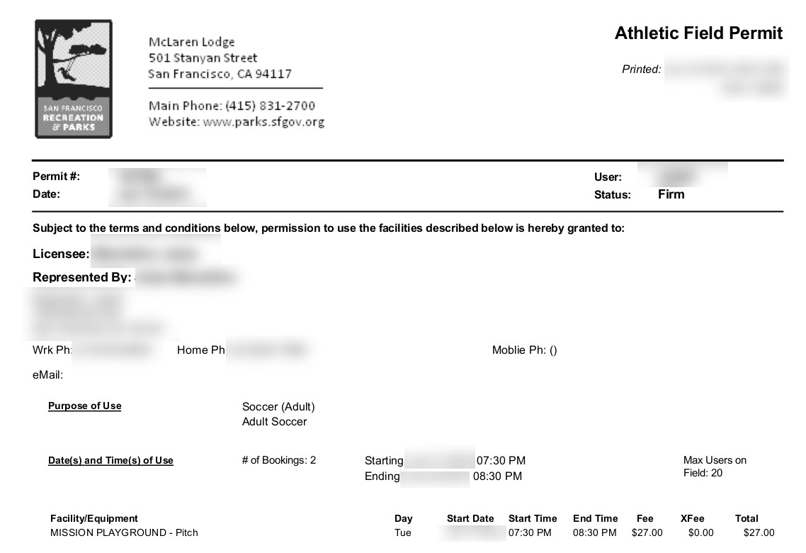But when the cement field was remodeled with artificial lawn a few years ago, the city determined that "free play" was now limited to Mondays, Wednesdays, and Fridays, whereas on Tuesdays and Thursdays, paying customers could rent it for $27 per hour for exlusive use. I guess it makes sense to somehow recoup the money for the remodel, but quite predictably, the regulars ignored the inconspicuously posted signs and kept playing, including on the days where the field was rented out. When the paying customers arrived at the scene, waving their permits (Figure 3) around, and demanding to use the field, the kicking and screaming began.