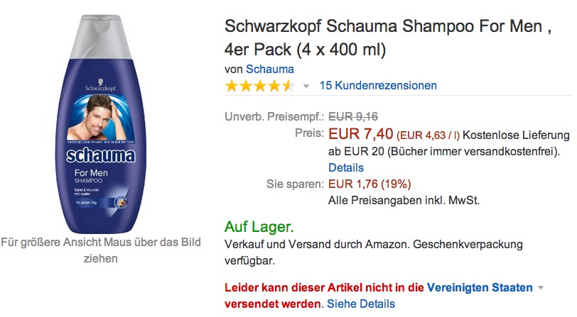 It's telling that Americans still say "shipping" when mailing packages, although, even internationally, hardly anything gets actually sent by ship anymore, unless it's a really heavy item like a table saw. But as the restrictions for airmail in the U.S. continue to become more and more ridiculuous, shipments by ship may become viable again. Recently, the German Amazon.de site even stopped shipping beauty products like bottles with hair shampoo (Abbildung 8) to the U.S.!