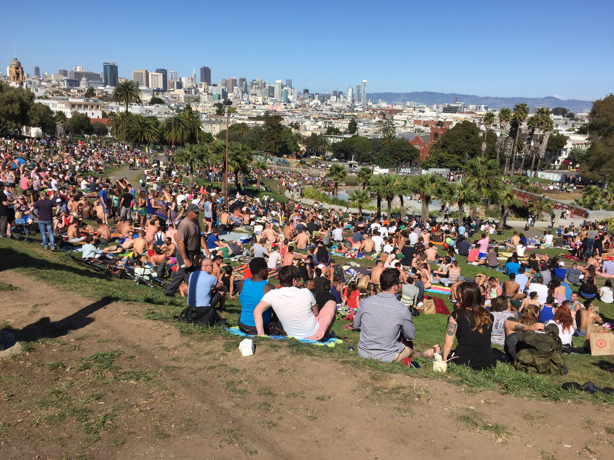 Angelika Der Dolores Park befindet sich gleich bei uns um die Ecke und hat schon immer zu einem der beliebtesten Stadtparks gehört, den vor allen Dingen Leute aus den angrenzenden Stadtteilen Noe Valley, Castro und der Mission frequentieren. An sonnigen Wochenenden wird es von jeher voll im Dolores Park. Aber bisher ging alles recht zivilisiert zu. Kinder spielten auf dem Spielplatz, Freunde trafen sich zum Picknick, durchtrainierte Herren, die der Schwulenszene im Castro angehören, sonnten sich in knappen Badehosen, Mexikaner aus der Mission spielten Fußball auf den grünen Wiesen, Hundebesitzer führten ihre Hunde spazieren und Tennisfans konnten den Schläger schwingen auf den zum Park zugehörigen Tennisplätzen. Und das alles mit einem fantastischen Ausblick auf Downtown San Francisco.