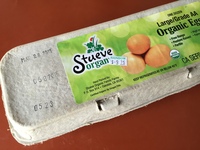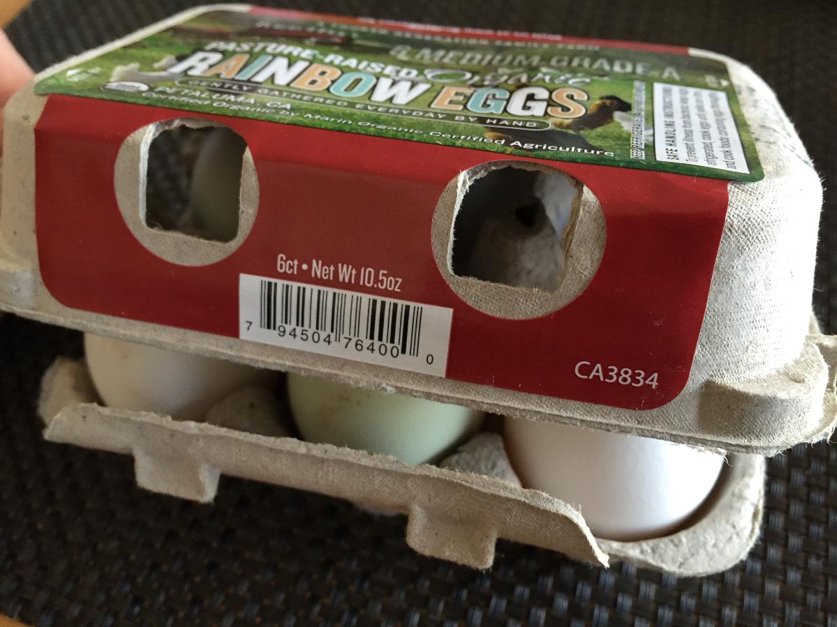 Allerdings führt unser Edelbiomarkt "Whole Foods" seit neuestem Eier von glücklichen freilaufenden Hennen zu einem exorbitanten Preis, die jedesmal gleich gut schmecken. Mit fünf Dollar pro 6er-Pack sind sie allerdings gut dreimal so teuer wie andere angebliche Bio-Produkte, aber wenn man wie wir vielleicht zweimal pro Woche ein Frühstücksei isst, fällt der Mehrpreis nicht weiter auf. Der Eiersechserpack der Firma "Rainbow" (meines Wissens nicht verbandelt mit dem famosen Supermarkt "Rainbow Groceries") repräsentiert zudem typisches San Francisco Multi Kulti: Die Eier sind alle verschiedenfarbig, manche weisen sogar einen seltsamen Grünton auf. Der Osterhase ist dabei, soviel ich weiß, nicht im Spiel.