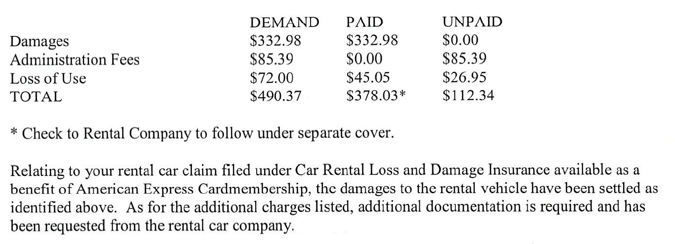 Ich wählte die auf dem Brief angegebene Telefonnummer, bekam einen sehr professionell klingenden jungen Mann an den Apparat und erzählte ihm, dass meine Amex-Kreditkarte den Schaden übernehmen würde. Ich bestätigte meinen Namen und Adresse und die Nummer des von mir an Amex übermittelten Schadensberichts an Amex. Das war's! Zwei Wochen später lag ein Schreiben von Amex im Kasten, mit der Bestätigung, dass Amex von den geforderten $490.37 exakt $378.03 bezahlt hatte (Abbildung 5). Die Schadenssumme von $332.98 hatten sie ganz übernommen. Von den geforderten $72.00 an Ausfallgebühren übernahmen sie nur $45.05, übrig blieben $26.95, sowie die Verwaltungsgebühren in Höhe von $85.39, die, und da hatte mich der Herr von Viking am Telefon schon vorgewarnt, Amex nicht berappen würde. Also blieben insgesamt $112.34 an mir hängen. Auf die Rechnung des Geldeintreibers warte ich noch, und werde sie, falls sie noch eintrudelt, gegebenenfalls per Scheck bezahlen.