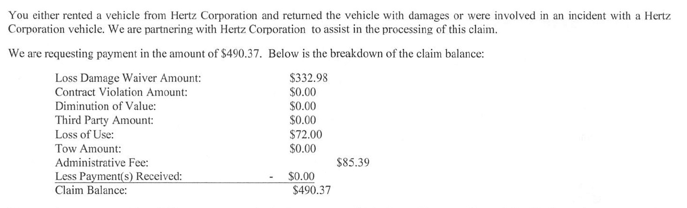 Dann geschah drei Wochen nichts, als plötzlich ein Brief von "Viking Billing Services" ins Haus flatterte, der mit den Worten "You recently rented a Hertz car" begann. Der stammte offensichtlich vom Geldeintreiber der Hertz-Autovermietung und wie in Abbildung 4 ersichtlich, wollten sie insgesamt 490.37 Dollar sehen. Die Summe setzte sich zusammen aus dem eigentlichen Schaden ($332.98), der Schadensausfallgebühr ("Loss of Use", also die Mietgebühr für die Tage, an denen Hertz den Wagen wegen Reparaturarbeiten nicht vermieten konnte), und einer Verwaltungsgebühr von $85.39.
