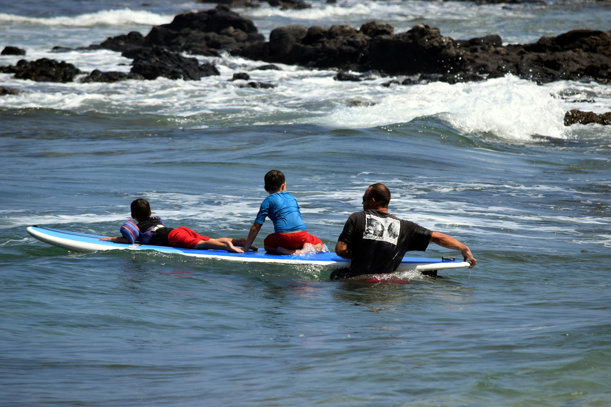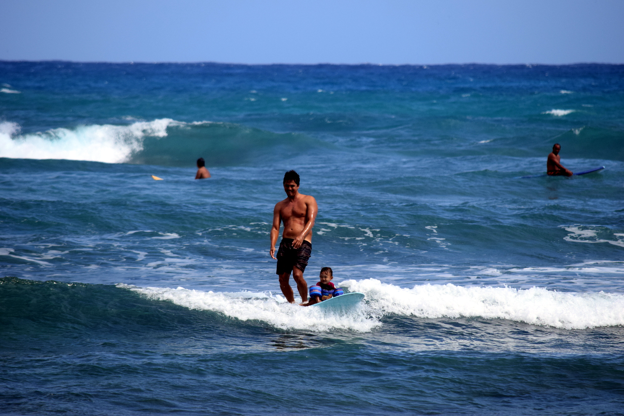 Die neueste Gaudi leisten sich Familienväter mit Kleinstkindern, die selber noch kein Surfbrett oder Boogieboard manövrieren können. Dabei sitzt das Kind auf dem vorderen Teil des Bretts und der Vater oder die Mutter stellen sich auf das Brett, wenn die Welle kommt und lenken das Surfbrett mit Kind dann durch das Wasser. Ich beobachtete das völlig fasziniert vom Strand aus, denn die Kinder waren in der Regel noch im Windelalter. Aber in Hawaii wird man bekanntlich mit dem Surfbrett geboren und früh übt sich, wer ein Meister in dieser Disziplin werden will. Sogar bei uns zuhause ist Michael mittlerweile bestimmt drei-, viermal die Woche an unserem Hausstrand in Pacifica, surft wie ein Weltmeister und fühlt sich bereits wie auf Hawaii.