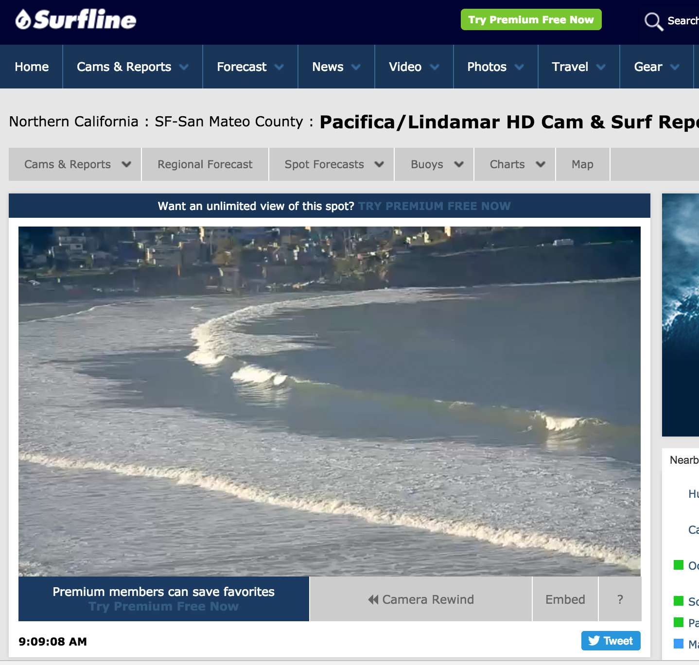 The service is free if you just take a quick look and don't let advertising videos deter you, for a Premier account you will be charged $14.95 per month. I'll have to conced though that the company Surfline is run by idiots who have no idea on how to run a business, just like the German internet sheep farmer operator Sauspiel, who also leaves half of its potential profits on the table. If Surfline would only charge $5 per month, they would have a lot more subscribers, but the people there probably work only in short breaks between a dozen surf sessions per day. Hey, money is not important to me, man!