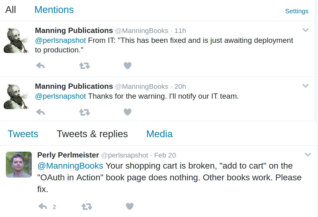 Ein Win-Win für alle Beteiligten: Der unzufriedene Kunde fühlt sich ernstgenommen und die Firma zeigt PR-wirksam, dass sie bei Kundenbeschwerden sofort Köpfe rollen lässt, um Verbogenes gerade zu richten. In Abbildung 2 seht ihr zum Beispiel, dass ich versucht hatte, auf der Website des Fachbuchverlags "Manning" ein Buch zu kaufen, deren Shopping-Cart-Software aber offensichtlich von umgeschulten Einkaufswagenschiebern programmiert worden war und mich das gewünschte Buch nicht kaufen ließ. Kurze Zeit später tweetete Manning, dass das Engineering-Team benachrichtigt worden sei und am nächsten Tag funktionierte der Einkauf durch einen über Nacht eingespielten Fix. Ich als Kunde fühlte mich als König, vergessen war mein Groll vom Vortag. Was haben wir nur vor der Erfindung des Internets gemacht?