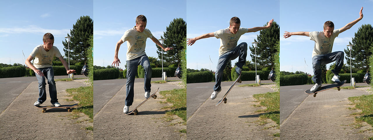 Der umgekehrte Fall, bei dem der Fahrer von der Straße am Randstein hoch auf den Gehweg springt, erfordert jahrelange Übung, bis man den sogenannten "Ollie" beherrscht. Dieses Manöver galt lange Zeit als völlig unmöglich und wurde erst 1978 erfunden, also lange nachdem es Skateboards gab, und zwar von einem Amerikaner namens Alan "Ollie" Gelfand. Der fand heraus, dass man ein Skateboard bis zu einem Meter hoch horizontal in die Luft katapultieren kann, und zwar ohne externe Hilfsmittel oder die Hände einzusetzen. Der Fahrer tritt beim Ollie mit voller Kraft auf den hinteren Teil des Boards, bis dieses auf dem Boden aufschlägt, um gleichzeitig den Vorderfuß am Brett entlang Richtung Boardspitze gleiten zu lassen. Diese Doppelbewegung bäumt das Board zunächst vorne auf, um es sofort danach wieder waagrecht auszurichten, und zwar in ziemlicher Höhe über dem Erdboden. Richtig gute Fahrer springen so nicht nur Randsteine hoch, sondern können oft scheinbar mühelos über Bierkisten, gespannte Seile oder Parkbänke fliegen.