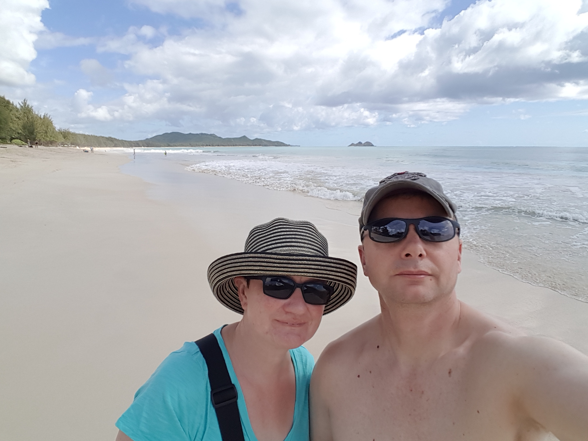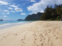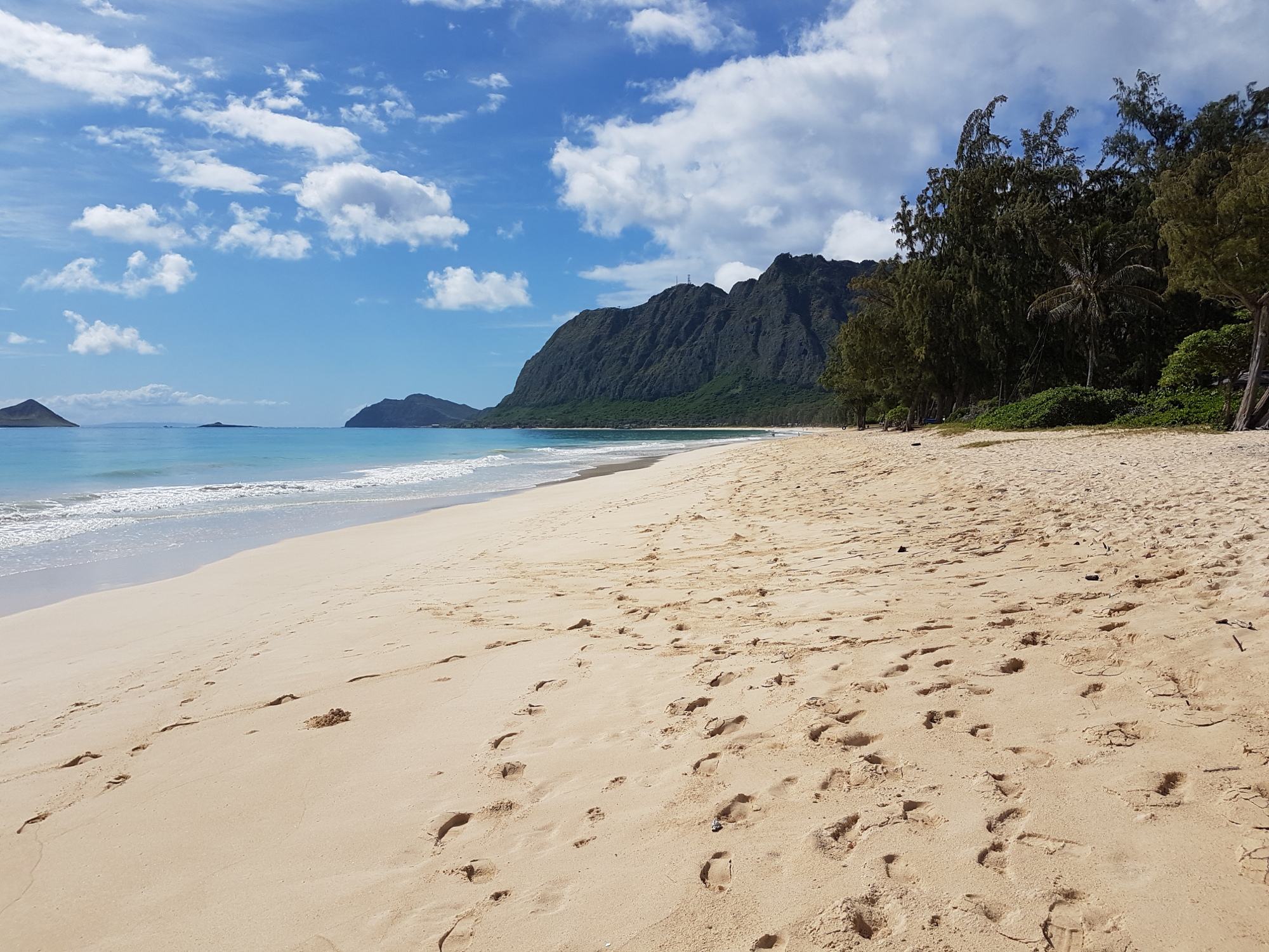 Aber wir fahren ja nicht nur nach Hawaii um zu essen. Der pazifische Ozean und die Strände sind der Höhepunkt eines Hawaii-Urlaubs. Und Waimanalo hat einen der besten Strände der Insel vorzuweisen. Er ist buchtartig und 9 km lang. Der Sand weiß und staubfein und das Wasser türkisfarben und hat super Wellen zum Boogie-Boarden für Anfänger. Der Strand ist vor allen Dingen wochentags fast menschenleer. Am hinteren Ende des Waimanalo Beachs befindet sich die Militärbasis "Bellows Air Force". Der "Bellows Beach Park" auf der Militärbasis ist nur am Wochenende für die Normalbevölkerung zugänglich. Eigentlich ungewöhnlich auf Hawaii, denn Hawaii kennt keine Privatisierung von Stränden. Jeder Strand muss öffentlich zugänglich sein. Da der Strand in Waimanalo aber so riesig ist, zog es uns eh nicht in die Ecke der Militärbasis. Auf jeden Fall ist Waimanalo ein Geheimtipp.