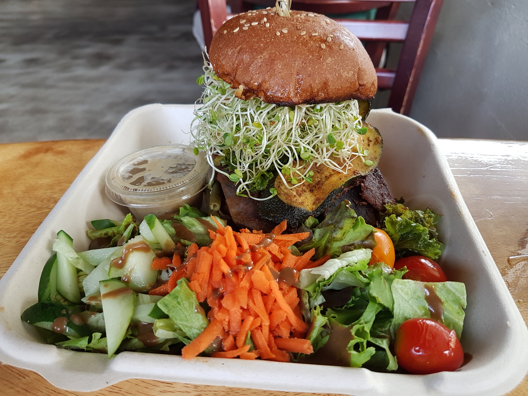 Neben dem etwas deplazierten McDonald's an der Hauptstraße machte vor 2 Jahren im August 2015 ein veganes Restaurant auf mit dem schönem Namen "Ai Love Nalo" (also "Ich liebe Nalo") auf, wobei sich hinter "Nalo" die Abkürzung füe Waimanalo verbirgt. Enthusiastische, freundliche Menschen kochen hier, ohne Tierprodukte zu verwenden und unterstützen hawaiianische Bio-Bauern. Das Essen war spitzenklasse. Ich aß ein mediteran angehauchtes Gericht, die "Medi Bowl", und schwärme immer noch von dem Rote-Beete-Hummus und Michael labte sich an einem Portobello-Pilz-Burger.