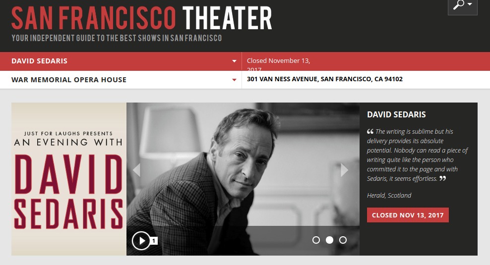 Die Abend in der Oper in San Francisco hat uns dann auch super gefallen. Sedaris bestritt die ungefähr 90-minütige Lesung am Stehpult und las unter anderem Auszüge aus seinem neuen Buch "Theft by Finding", das eine Zusammenstellung aus seinen Tagebüchern ist, die er seit 1977 führt. Wir hatten gute Plätze, die ich auf dem Online-Portal StubHub ergattert hatte. Die Karten waren auf den Namen des ursprünglichen Käufers ausgestellt gewesen und per Email zugesandt worden. Vor Ort wurden die Ausdrucke aber anstandslos eingescannt und akzeptiert, obwohl ich schon etwas geschwitzt habe.