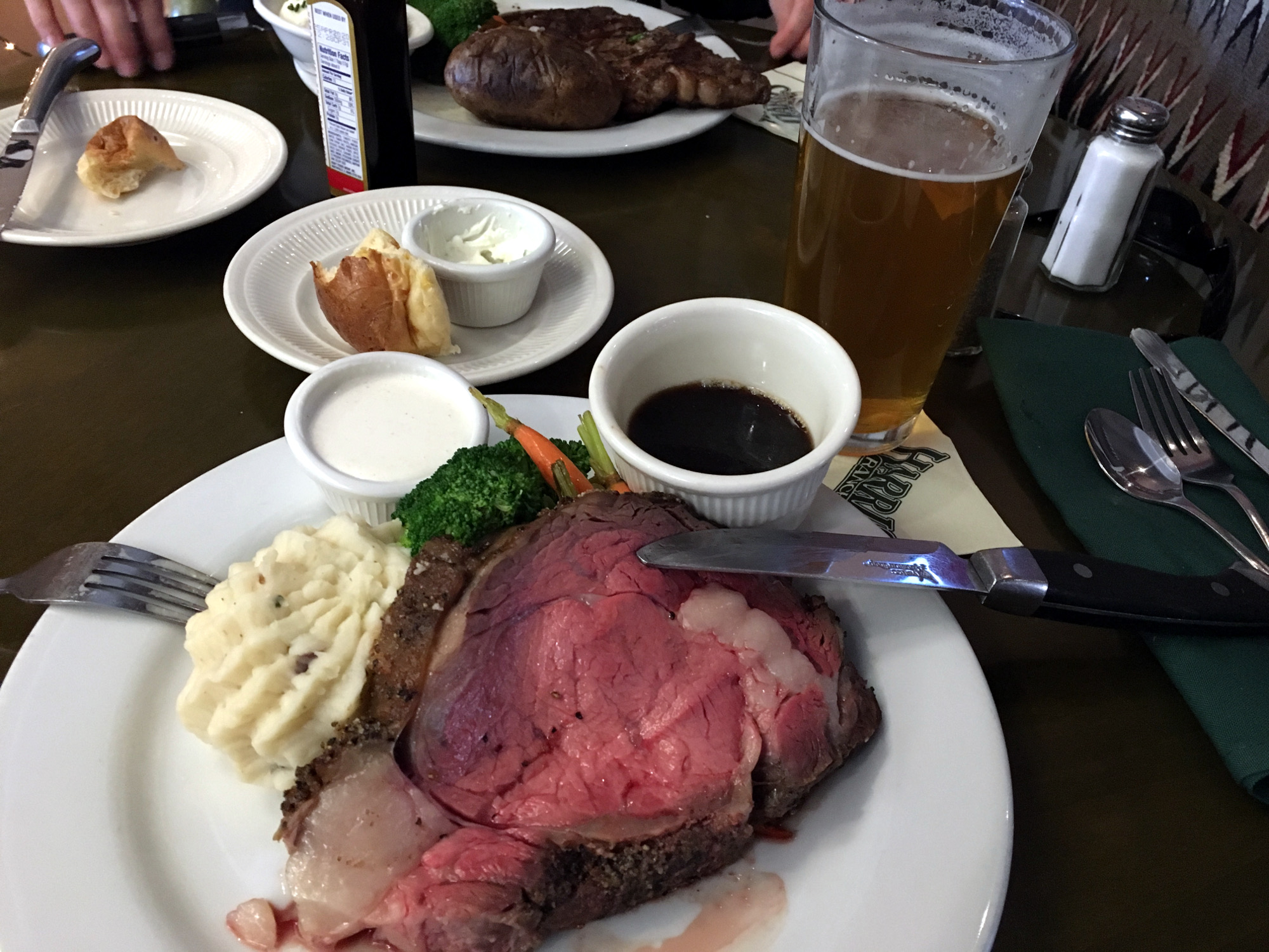 Als Autofahrer kämpft man gegen die Müdigkeit auf dieser Strecke an. Wir halten deshalb immer an der Harris Ranch an, die 300 Kilometer südlich von San Francisco am I-5 in Coalinga liegt. Weit und breit gibt es nur Felder und plötzlich taucht aus dem Nichts die Ranch mit Restaurant, Hotel, Tesla-Aufladestation und Souvenirgeschäft auf. Das Restaurant ist riesig und hat drei verschiedene Bereiche; eine Bar, ein Steakhouse und noch ein weiteres Restaurant, wo sich meist die Familien mit Kindern tummeln, weil diese nicht in die Bar dürfen. Wir gehen in der Regel in die Bar, denn dort bekommt man schneller einen Tisch. Das Restaurant ist allerdings nichts für Vegetarier, denn hier gibt es saftige Sreaks in allen Ausführungen, was natürlich auch daran liegt, dass die Harris Ranch einer der größten Rindfleischhändler und --produzenten in Kalifornien ist. Seit 1937 befindet sie sich in Familienbesitz, ist also eine echte kalifornische Instutition.
