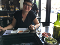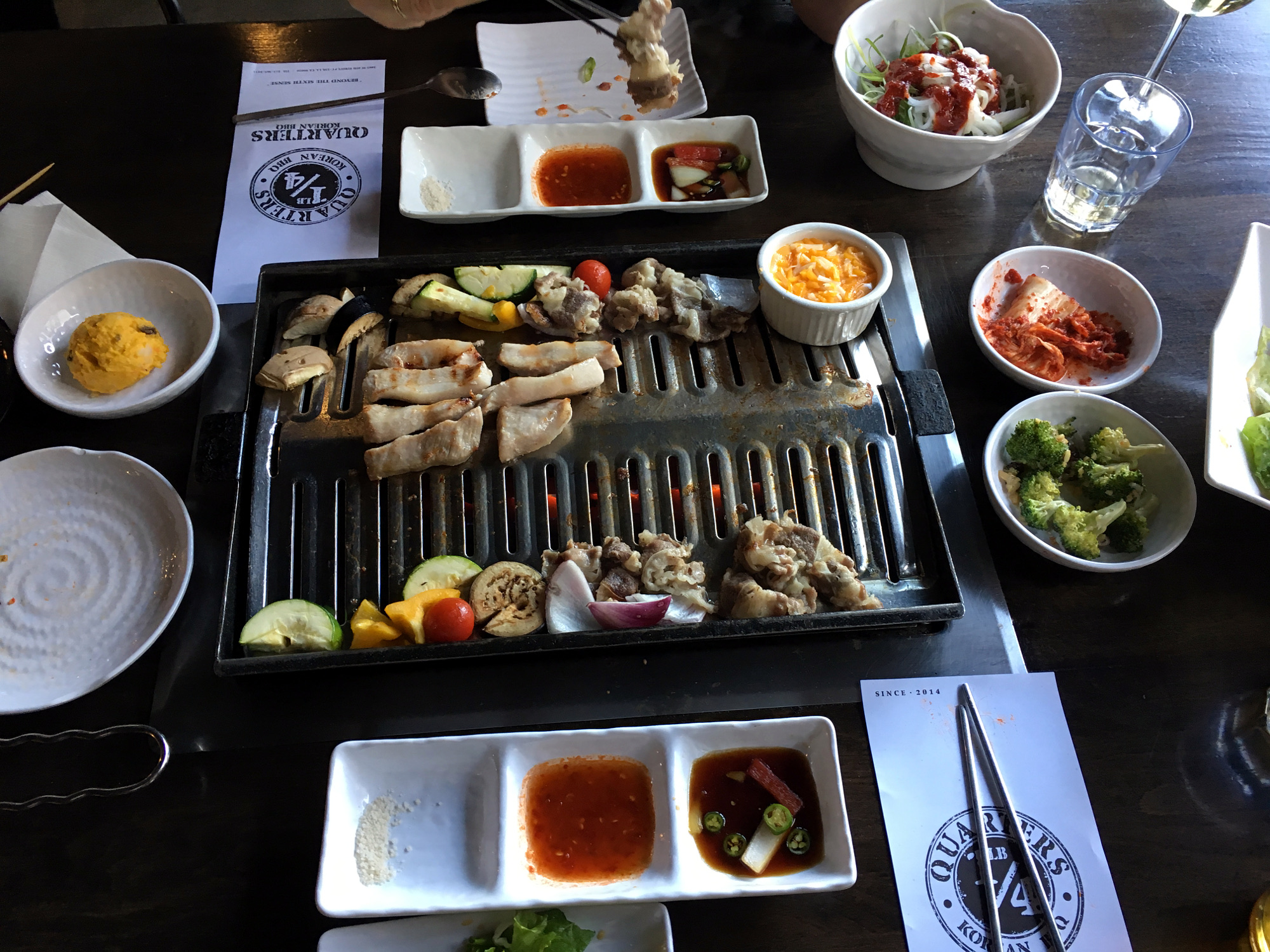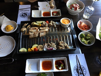 Wir fuhren, typisch für Los Angeles mit dem Auto, an einem Wochentag gegen halb drei Uhr nachmittags nach Koreatown, standen ein bisserl im Stau, parkten, und gingen schnurstracks in einen der angesehensten BBQ-Schuppen dort, das "Quarters". Trotz der ungewöhnlichen Stunde mussten wir 15 Minuten auf einen Tisch warten, am Abend, so stand es auf Yelp, beträgt die Wartezeit mehrere Stunden. Das Essen war sehr lecker, wir bestellten die Anfängerkombination aus Rind- und Schweinefleisch, und auf dem Tisch standen etwa 10 Töpfe mit kleinen Vorspeisen wie Kim-Chi oder eingelegten Gurken. Das Mittagsmahl kostete mit Getränken etwa $100, also in etwa das Preisniveau von San Francisco. Gegen Abend soll in der Bude der Bär abgehen, während junge Leute vor oder nach dem Besuch umliegender Clubs sich mit Grillfleisch stärken und dabei so laut quasseln, dass man sein eigenes Wort nicht mehr versteht. Das glaube ich ungeprüft!