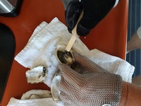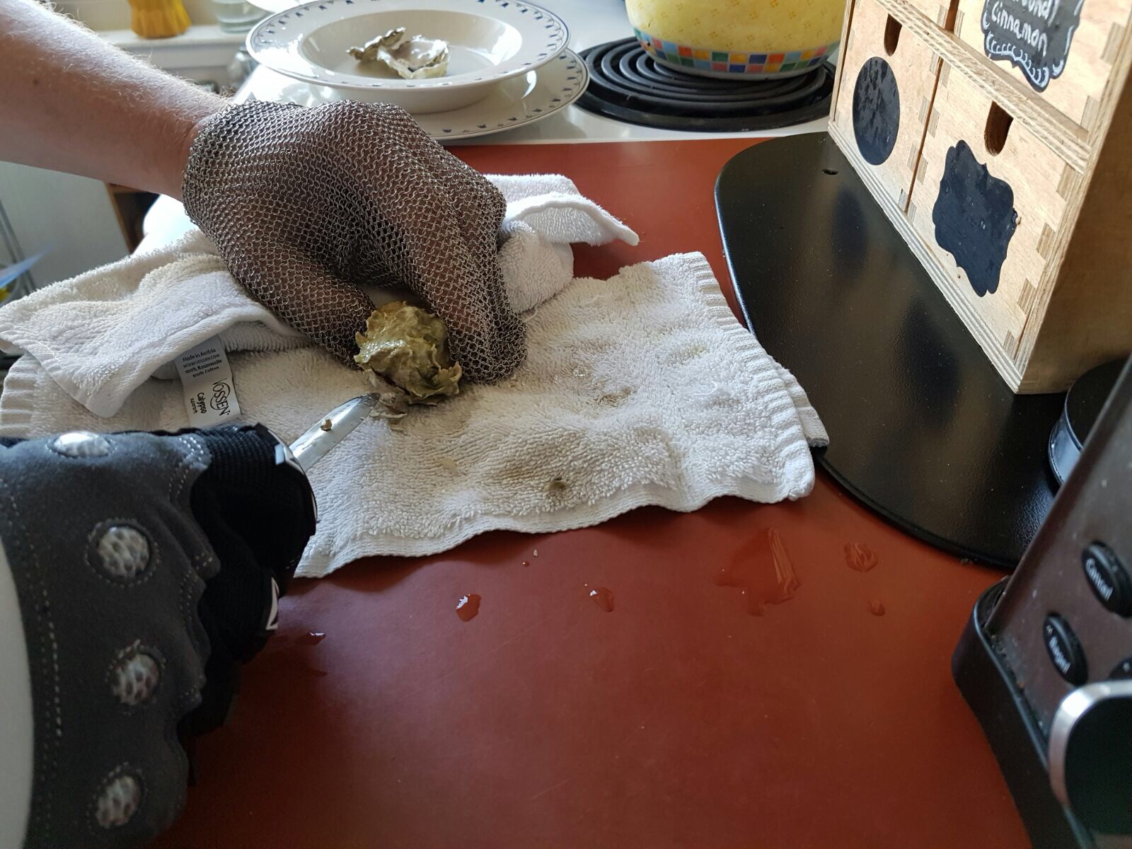 Auf einer Geburtstagsparty lernten wir vor einiger Zeit, dass man Austern auch im Großmarkt kaufen und mit etwas Übung selber öffnen und servieren kann. So fuhr ich eines Samstag morgens um zehn mit dem Auto schnell 10 Minuten in den Stadtteil Bayview rüber, um ein Dutzend roher Austern zu kaufen. Vorher hatte ich mir auf Amazon die dazu notwendige Sicherheitsausrüstung gekauft: Zwei Austernmesser sowie einen Eisenhandschuh "Made in Germany" zum horrenden Preis von fast 100 Dollar, aber da ich berufsmäßig viel und schnell tippen muss, sind meine Hände mein Kapital und da wollte ich kein Risiko eingehen. Außerdem hatte ich mir auf Youtube eine Reihe von Videos angesehen, in denen erfahrene "Oyster Shucker" zeigten, wie's gemacht wird.