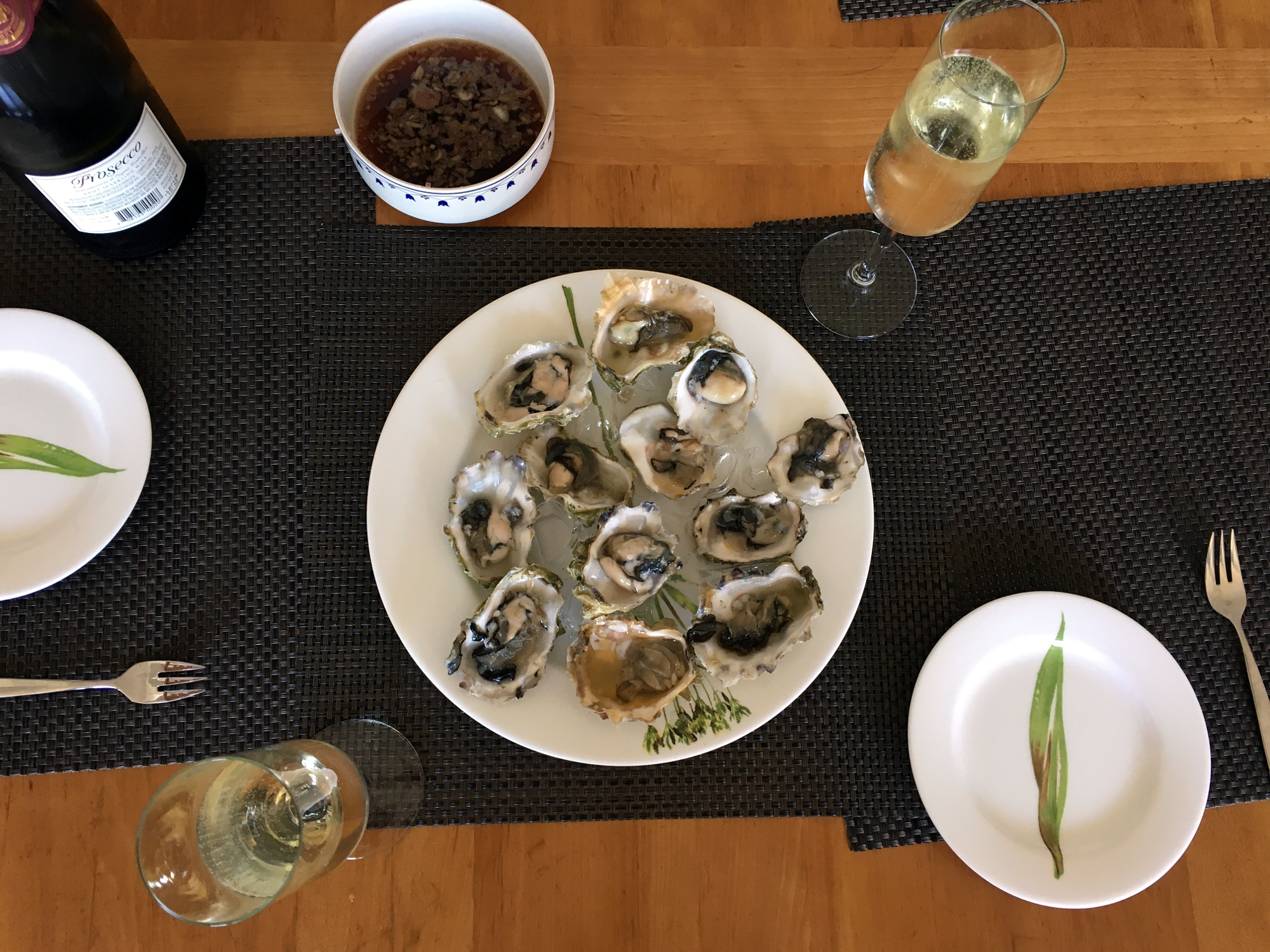 Daheim legte ich die Austern einzeln mit der bauchigen Seite nach unten auf ein Handtuch, fuhr mit dem Austernmesser, wie auf den Youtube-Videos gesehen, in das schmale Scharnier am Längsende hinein, während ich die Auster mit der gepanzerten linken Hand festhielt. Man muss kraftvoll hineinfahren, darf aber die Öffnung dabei nicht zersplittern lassen, sonst hat man beim Essen später den Mund voll mit kleinen Schalensplittern. Dann hebelt man die Auster seitlich auf, fährt mit der Messerklinge blind ans obere Ende und schneidet den oberen Schließmuskel ab, möglichst ohne das Innere der Auster zu verletzen. Danach lässt sich der obere Deckel einfach abnehmen, und nachdem man mit dem Messer das Austernfleisch auch an der bauchigen unteren Seite von der Schale getrennt hat, legt man sie auf das Eis im Servierteller, fertig!
