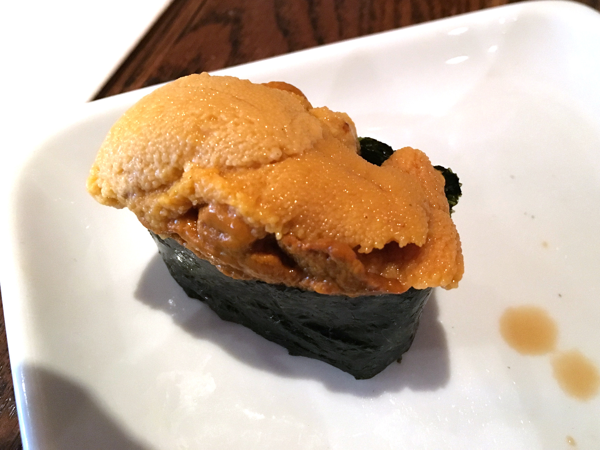 Weiter teile ich Sushifreunde in drei Kategorien ein: Die einen, die denken, dass "California-Rolls" Sushi seien, die in Amerika populären Maki-Röllchen mit Avocado und Snow-Crab. Dann diejenigen, die sich zum Aal (Unagi) mit Teriyaki-Soße vorgewagt haben, und Hamachi (Yellowfin-Tunfisch) mögen oder Torro (der fettere Tunfischbauch). Und schließlich die Profis, die Fischrogen in verschiedenen Formen (Tobiko, Ikura) bestellen, sowie die Leber vom Seeteufel (Ankimo), und schließlich die Königin des Profi-Sushi, hergestellt aus den Geschlechtsdrüsen des Seeigels, genannt Uni (Abbildung #1).