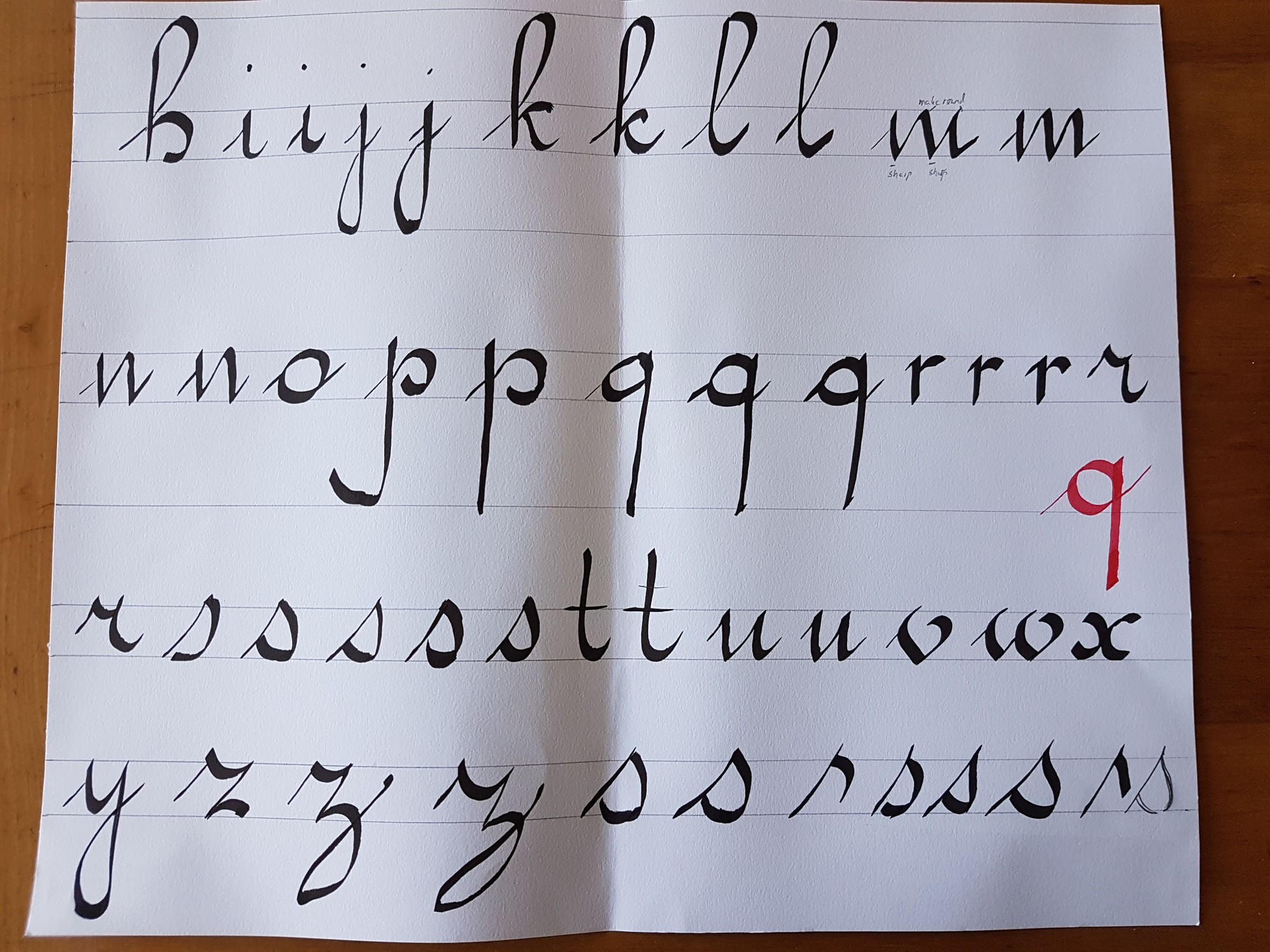 Dann erfüllte ich mir noch den Traum, einen Kalligrafiekursus zu besuchen. Ich gehöre noch zu der Generation, in der Schreibschrift zu lernen oberstes Gebot in der Schule war. Leider ist diese Kulturtechnik vom Aussterben bedroht, da man meint, dass in der digitalen Welt Tippen und Druckschrift über der Schreibschrift stehen. In den USA lernen schon viele Schüler keine Schreibschrift mehr, weil sie vom Lehrplan gestrichen wurde. Allerdings gibt es Hoffnung, denn die Schreibschift erlebt hier zur Zeit so etwas wie ein Comeback in den Schulen, da sich herausgestellt hat, dass es eben nicht nur um Schönschrift geht. Das Erlernen der Schreibschift hilft nicht nur der Feinmotorik, sondern fördert auch das Gedächtnis und verbessert das Textverständnis. Schüler, die Scheibschrift schreiben, konstruieren bessere Texte, als wenn sie diese tippen würden.