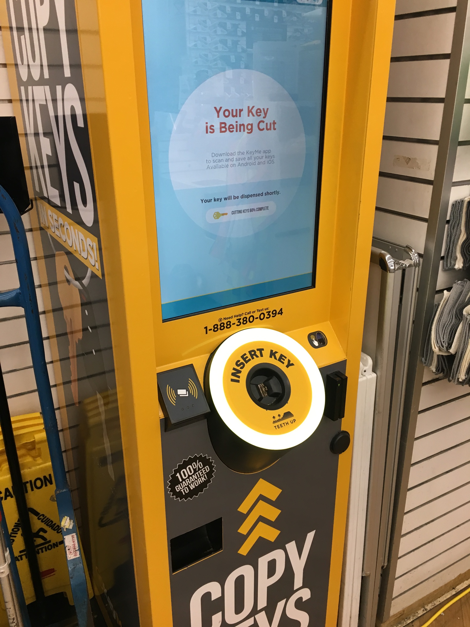 Michael Neulich erinnerte ich mich beim Besuch der Lebensmittelkette Trader Joe's daran, dass ich auch noch ein Duplikat unseres Wohnungsschlüssel anfertigen lassen wollte, und ein Schild vor dem Badezimmerladen "Bed, Bath, and Beyond" wies darauf hin, dass dies drinnen möglich sei. Ich erwartete, einen Schuster in einem kleinen Kabuff am Ausgang hinter den Kassen vorzufinden, der auch Schlüsseldienste anböte, aber sah stattdessen -- einen Automaten.