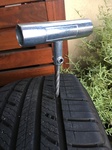Vor ein paar Tagen war es dann soweit: Der Integra stand auffällig schief in der Garage, und bei näherem Hinsehen stellte sich heraus, dass aus dem rechten Hinterreifen die Luft entwichen war. Eine Holzschraube steckte tief im Profil, und da dachte ich mir: Das probier ich jetzt mal mit dem Selberflicken.