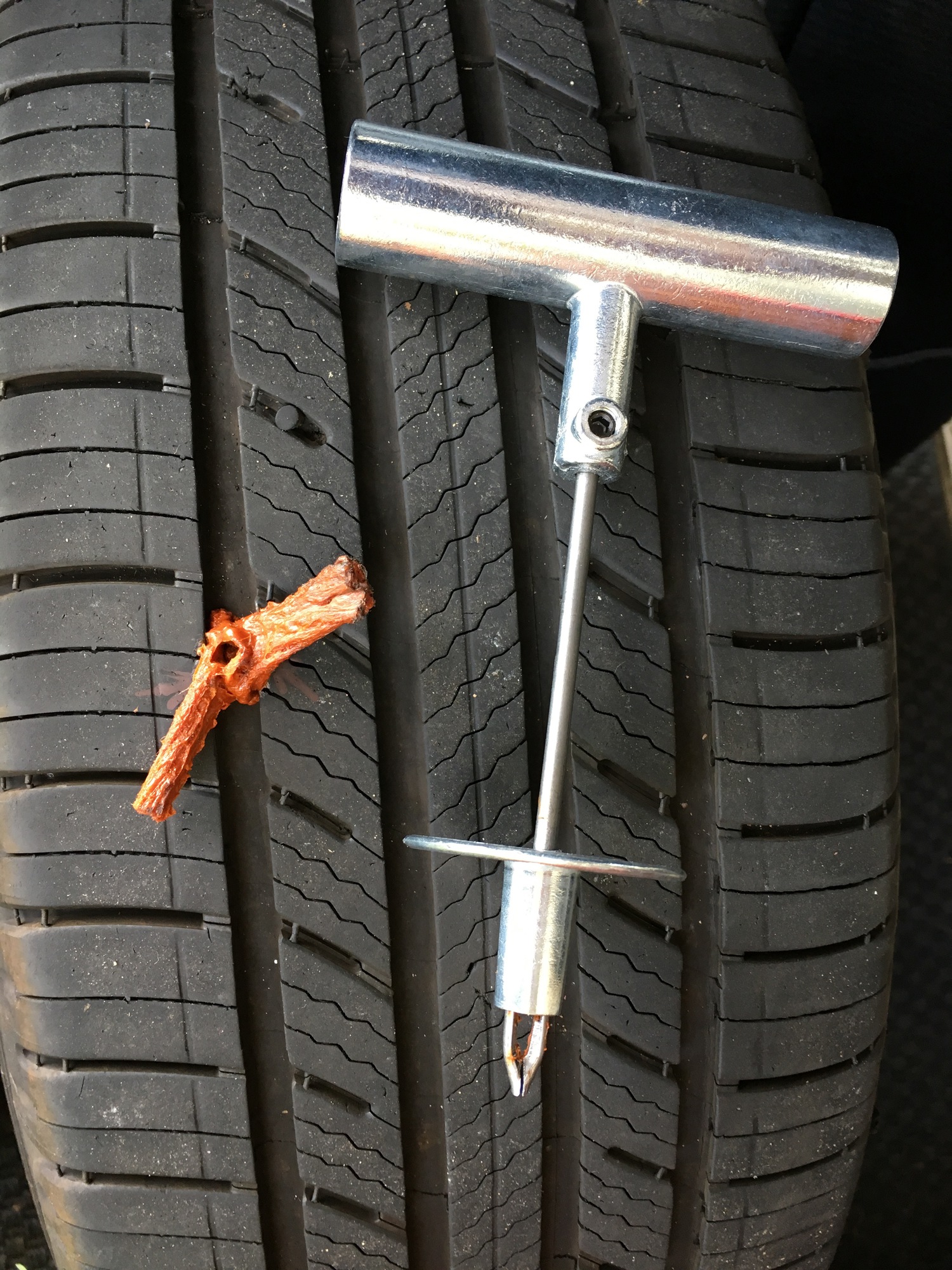 Das Prozedere bei platten Autoreifen ist für uns hier in den USA deswegen schon Routine: Wagen aufbocken, Reserverad draufmachen, zum Reifenfritzen fahren und flicken lassen. Von amerikanischen Bekannten erfuhr ich allerdings vor einiger Zeit, dass man Reifen hier auch selber flicken kann, mit für etwa 10 Dollar gehandelten Reparaturkits. Also bestellte ich bei Amazon vorsorglich so ein Patchkit und lagerte es sorgsam ein.
