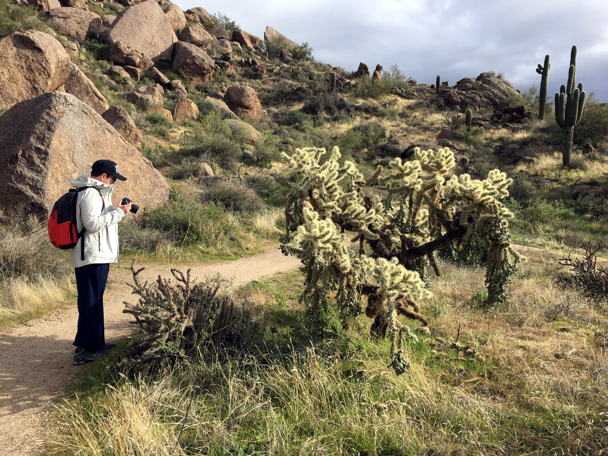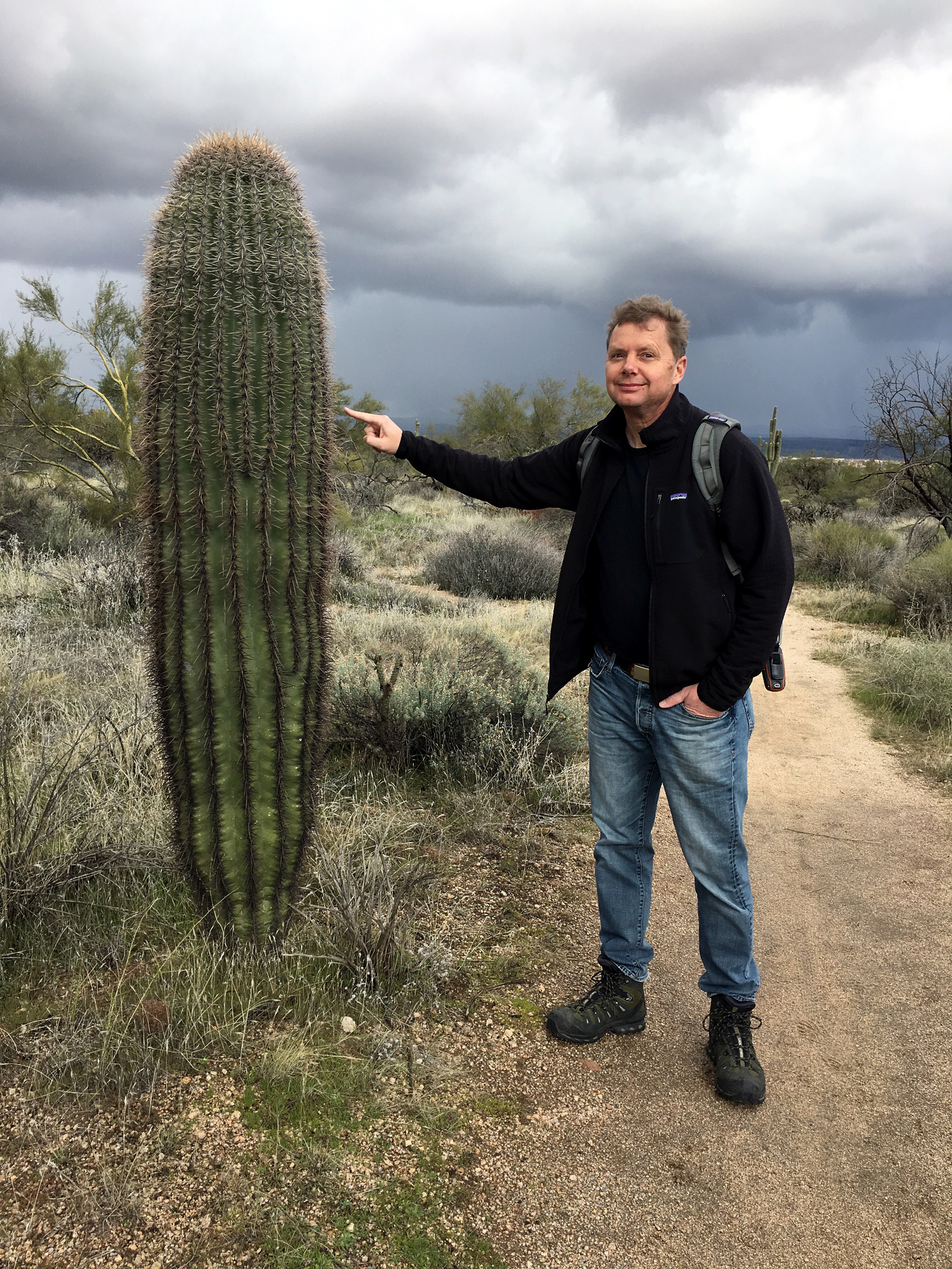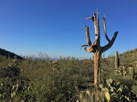 Wir wanderten jeden Tag, ohne uns zu verausgaben, meist so acht bis zwölf Kilometer, bei vielleicht maximal 300 Metern Höhenunterschied, und die Aussicht von den erklommenen steinigen Wüstenhügeln war gewaltig. Dabei kommt der Wanderer nebenbei an gigantischen Kakteen vorbei, die teilweise bis zu acht Meter in die Höhe ragen. An Wetter hatten wir alles, von prallem Sonnenschein, über leicht tröpfelnden Regen, bis zu einigen Schneeflocken, alles auf ein und demselben Trail, bei leichten Plusgraden. Im Sommer ist es dort mit über 40 Grad so heiß, dass man die ungeschützten Trails in der Mittagshitze nicht gehen kann.