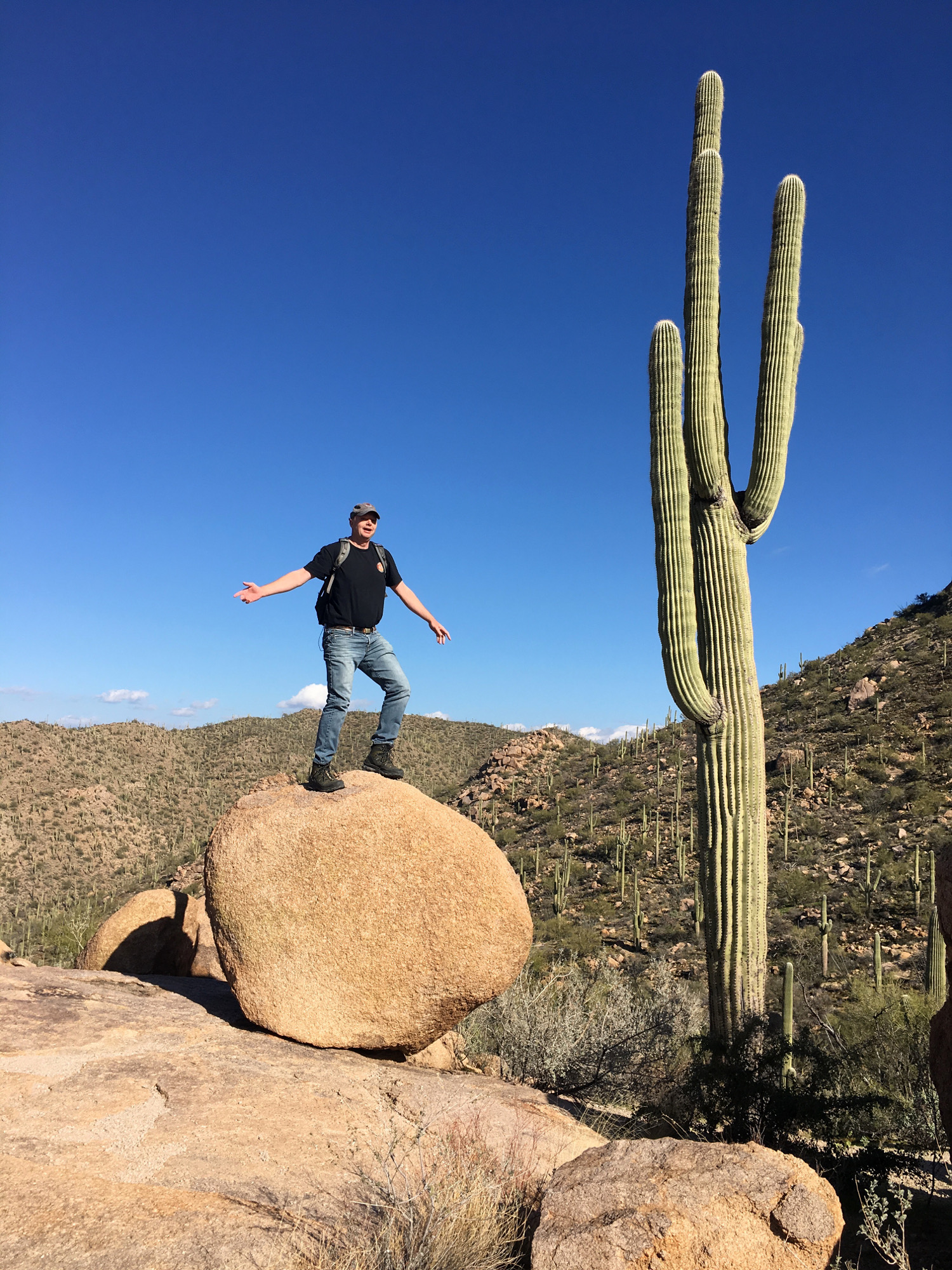 Scottsdale selbst besteht aus einer touristischen "Old Town" mit Klamotten-, Kosmetik- und grauenvoll kitschigen Galerieläden. Das könnte man sich auch sparen. Der Rest der Stadt ist groß aber dünn besiedelt, mit laaangen Straßenblocks. Scottsdale bietet relativ eintönige Shopping Malls und endlose Siedlungen mit Bungalows, ähnlich wie Phoenix. Die Auswahl an innovativen Restaurants ist aber erstaunlich gut, die allerdings gesalzene Preise verlangen, fast schon auf San-Francisco-Niveau. Zum Wandern trieb es uns zum "Granite Mountain Trail" im 40 Meilen nördlich gelegenen "McDowell Sonoran Conservancy" und zum anderthalb Stunden entfernten "Saguaro National Park", von dem weder Angelika noch ich jemals gehört hatten. In der Wüste Arizonas wachsen ja diese riesigen Kakteen, schon auf dem Weg vom Flughafen in Phoenix nach Scottsdale kann man sie auf beiden Seiten der Autobahn bestaunen.