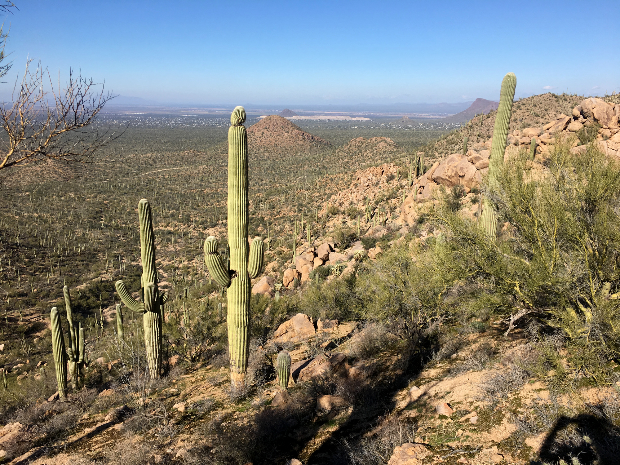 Die Straßen im Saguaro Nationalpark sind größtenteils ungeteert, und an den Wanderwegeingängen finden jeweils nur ein paar Autos Platz. Teilweise parkt man halbwild auf der Sandpiste, oder fährt ein paar Meilen im Staub, bis man den Wagen an der nächsten Ausbuchtung abstellen kann. Es waren nicht viele Leute da, aber Parkplätze gab es kaum noch welche, wer statt im tiefsten Winter in einer wärmeren Jahreszeit dort hinfährt, kann sich wohl auf ein Verkehrschaos gefasst machen. Bekanntlich fahren Amerikaner gerne im Kreis oder warten in zweiter Reihe, nur um direkt vor dem Loch zu parken. Zu Fuß vom Auto zum Startpunkt einer Aktivität zu laufen ist verpönt, auch wenn es sich um ein Fitnessstudio oder einen Wanderweg handelt.
