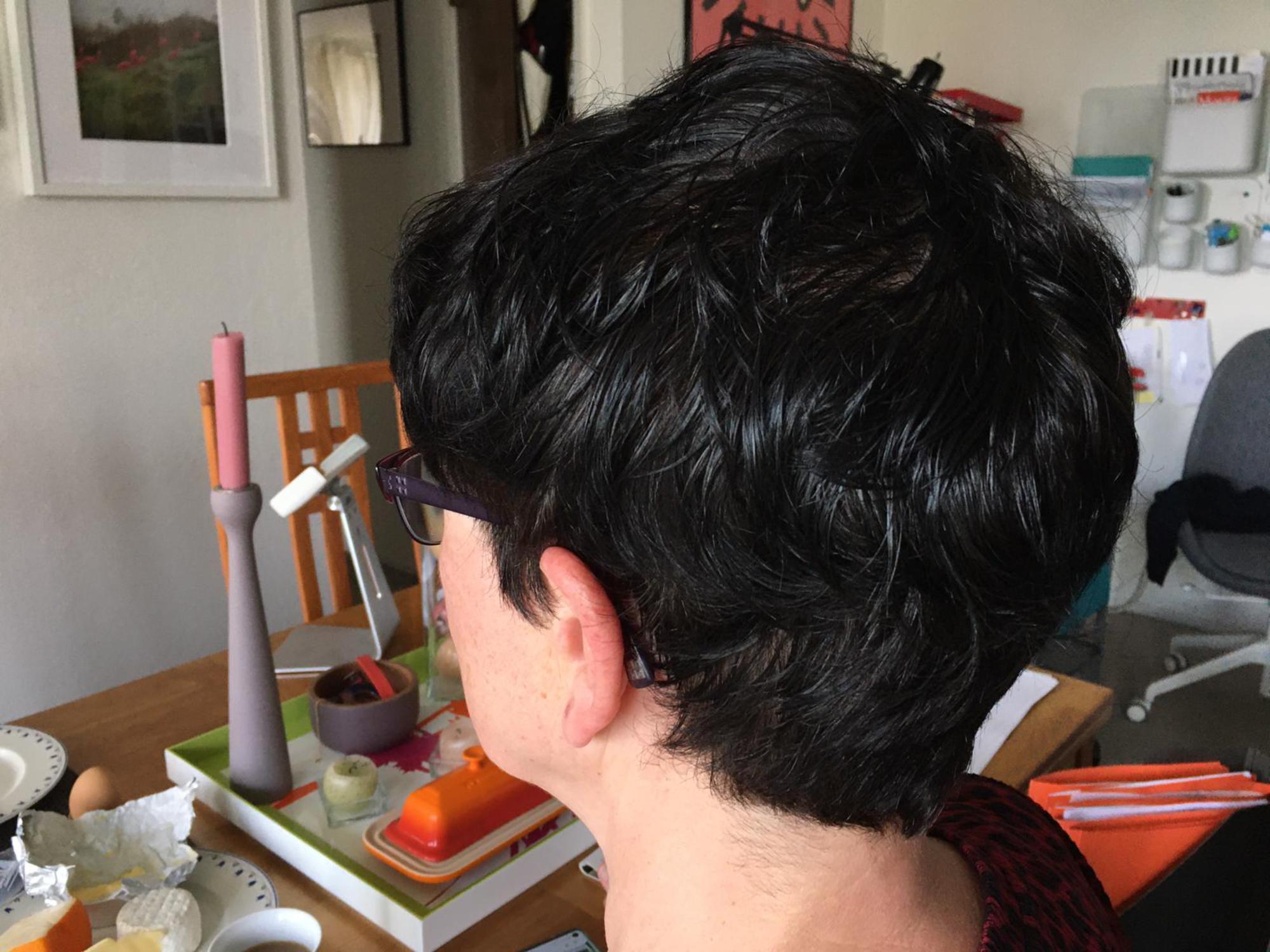 The result, after about half an hour of work with both devices, is quite impressive, I think (see Figure 5). When I come home from the hairdresser, I look somewhat similar, as my hair tends to be a bit unruly. Following this initial success, I also trimmed Angelika's short haircut with the trimmer and even gave her the professional coloring she had ordered from her regular hairdresser via contactless delivery. Although it was a tough job that took over an hour, the result was really satisfactory (see Figure 6). Conclusion: Professional service workers also put their pants on one leg at a time. With some practice, amateurs can achieve similar results.