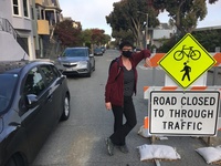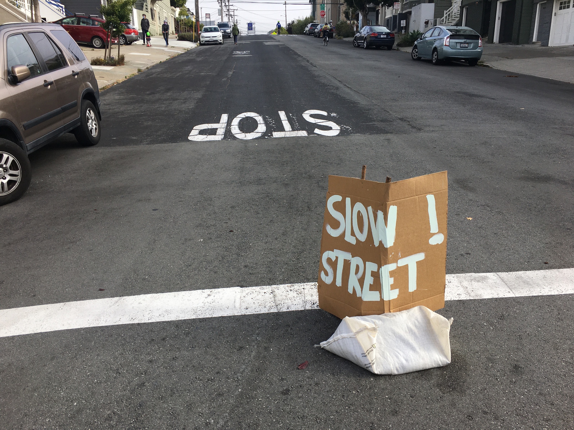Flugs riefen Angestellte der Verkehrsabteilung der Stadt, SFMTA, das Slow Streets Program ins Leben. An den Querstraßen stellten sie große Schilder auf, die mit der Aufschrift "Road Closed To Through Traffic" darauf hinwiesen, dass die verkehrsberuhigte Straße für den Durchgangsverkehr gesperrt ist.