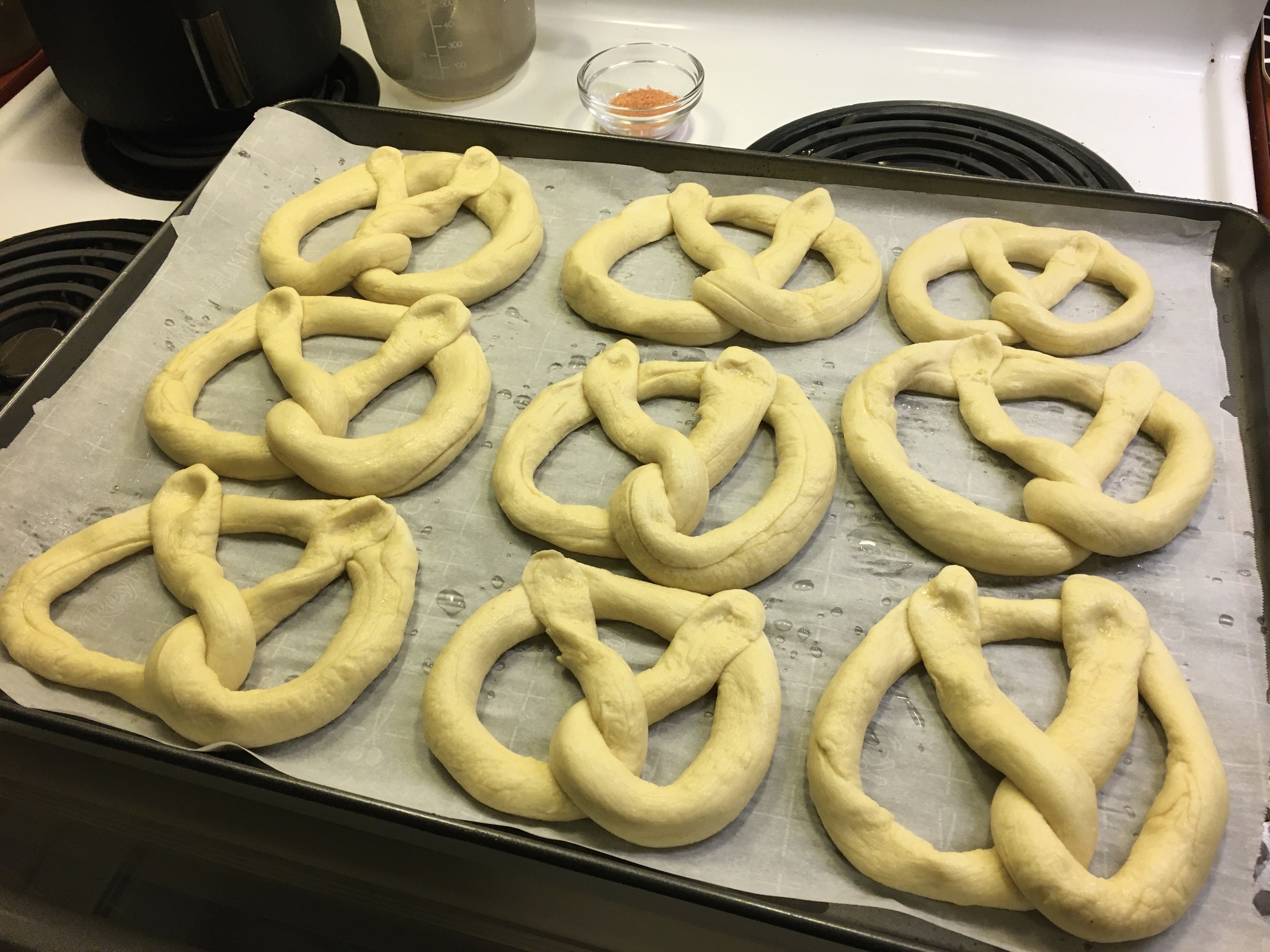 Next, roll out the cylinders long and thin, shape them into pretzels, briefly dip them into the diluted lye solution (using disposable gloves), and place them on a baking sheet. Sprinkle coarse salt on the pretzels and bake them in a preheated oven at 420 degrees Fahrenheit (215 degrees Celsius). After 20 minutes, take them out and let them cool on a rack. Done! I made my Own Pretzel Baking Video for YouTube . Check it out, like it, and subscribe, as the pros say.