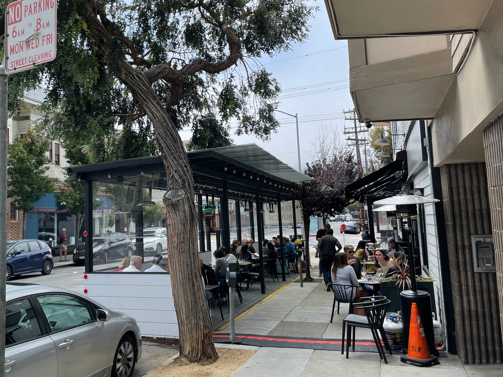 But tough times call for tough measures and the city started to cut through red tape and allowed restaurants to set tables on the sidewalk and even some parking spaces in front of their property, without much bureaucratic rigamarole. As Michael has pointed out here numerous times, cities like San Francisco a rife with unbelievable bureaucratic overhead, and just a few years ago it would have been unthinkable to turn parking spaces or sidewalks into restaurant zones. Hearings, years of endless heated discussions between car haters and residents demanding their parking spaces would have ensued, finally resulting in an inevitable deadlock.