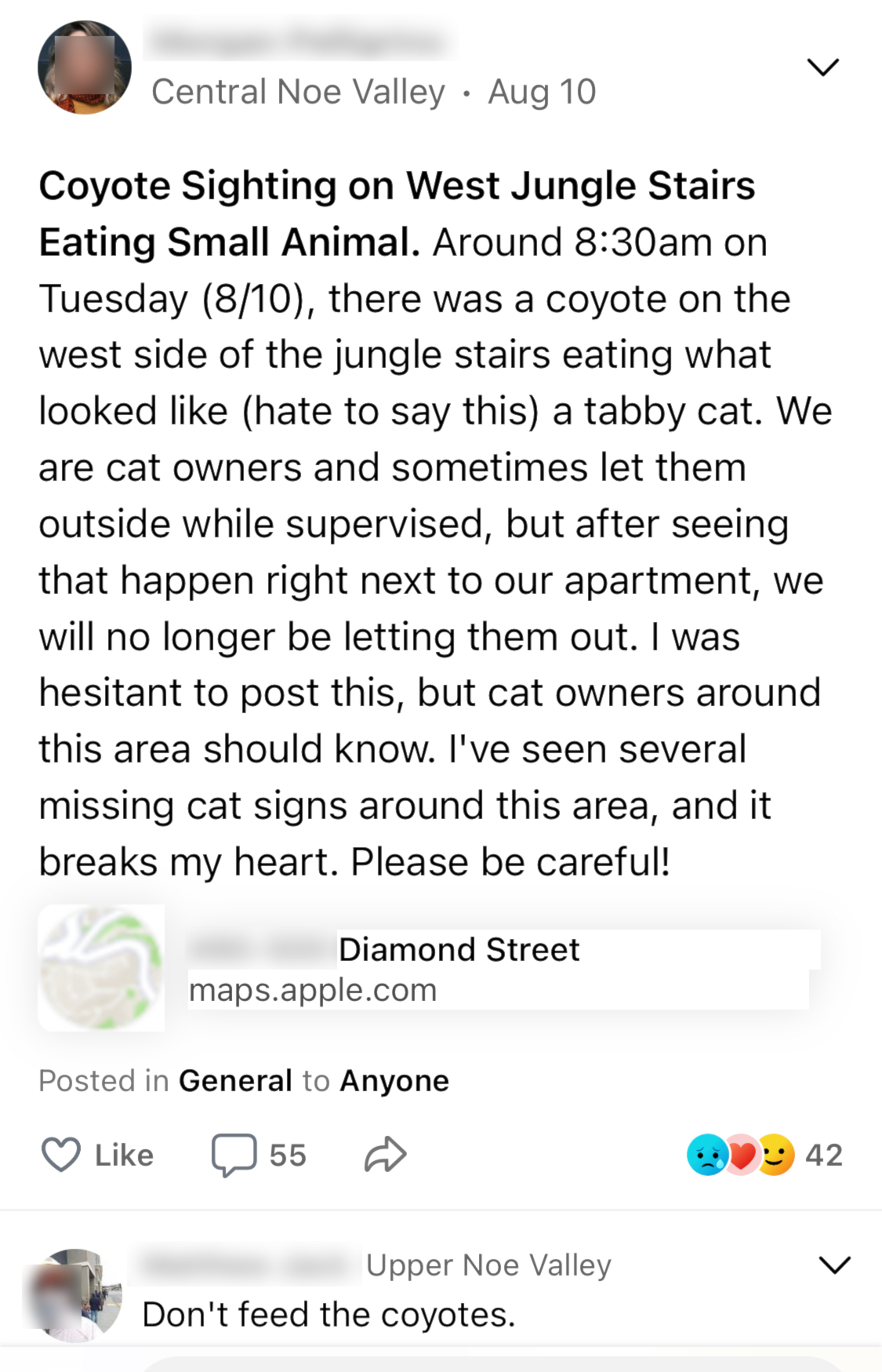 Haustiere sollte man nicht in die Nähe von Koyoten lassen, denn erstere sind unter Umständen dumm genug, die Wildhunde zu provozieren, und das geht dann sehr schnell nach hinten los. Auf dem Online-Forum Nextdoor hat neulich eine Anwohnerin darüber berichtet, dass sie beim Spazierengehen in unserem Viertel einen Koyoten beim Verspeisen einer gescheckten Katze beobachtet hat (Abbildung 4). Also Vorsicht!