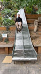 Nachdem das Paket mit der Bestellung endlich eingetroffen war, machten wir uns an einem Sonntagmorgen nach Bernal Heights auf, stellten sicher, dass keine Kinder in der Nähe waren, und schritten dann zur todesmutigen Durchführung des Experiments. Ich war mir ehrlich gesagt nicht ganz sicher, wie stark die reibungsfreie Beschleunigung mich nach unten katapultieren würde, und behielt vorsichtshalber meine Jacke an, um Abschürfungen vorzubeugen. Außerdem verfüge ich bekanntlich aufgrund langjähriger Kampfsporterfahrung über katzenartige Reflexe! Angelika befürchtete allerdings, ich würde in der Notfallaufnahme landen, erklärte sich aber nach einigem Zureden dennoch bereit, das Ganze zu filmen. Und, siehe da, es ging zügig abwärts, gerade schnell genug! Auch Angelika wagte die Fahrt, und beide Rundbriefreporter überstanden das Experiment ohne Verletzungen!