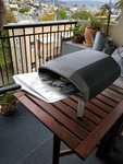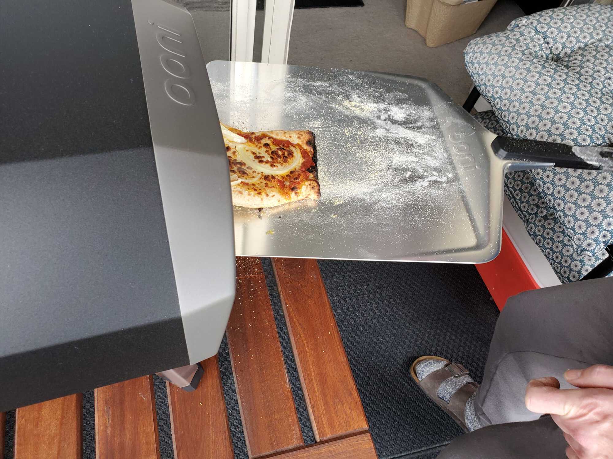 Nach Weihnachten schloss ich das Gerät sogleich an die Propangasflasche unseres Grills auf dem Balkon an, gab eine halbe Stunde lang Vollgas, bis das Infrarotthermometer aus meiner Werkzeugsammlung 750F (400 Grad Celsius) anzeigte, und dann schob ich eine handgeformte hauchdünne Pizza mit einem Belag aus Mozarella, Don-Peppino-Tomatensauce, Zwiebeln und Sardellen mit Hilfe eines großen Schiebers in die Öffnung, auf die im Ofen liegende Keramikplatte. Nach 30 Sekunden muss man die Pizza wieder mit dem Schieber rausholen, schnell drehen, und nochmals 30 Sekunden reinschieben, dann ist sie fertig. Schmeckte großartig! Erst die hohe Temperatur des Pizzaofens erzeugt diesen typischen Pizzeria-Geschmack, der ganz anders ist als der einer im heimischen Ofen gebackenen Pizza. Man muss nur aufpassen, dass der Teig bei den hohen Temperaturen nicht verkokelt oder gleich das Haus abbrennt, aber ich habe ja inzwischen genügend Erfahrung gesammelt, was das Handtieren mit einer klebrigen, dünnen Teigschicht in gefährlichen Geräten unter Extremtemperaturen betrifft. Topp-Produkt!
