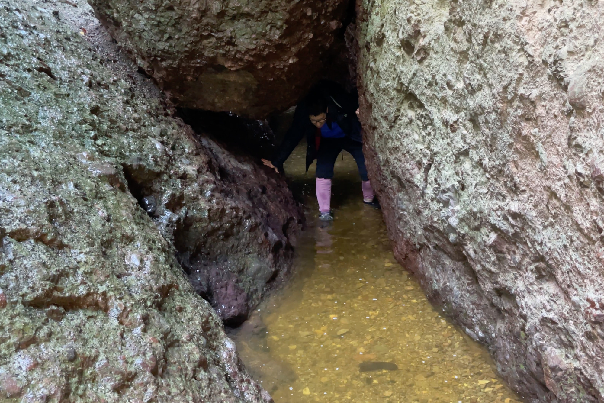 Wir schlotterten nicht schlecht, als wir durch mehrere knietief überflutete Höhlengänge wateten, und uns teilweise, mit den vollgelaufenen Schuhen unter Wasser watend, unter niedrigen Felsen durchducken mussten, aber wir kamen gut am Ausgang an. Dort zogen wir kurz unsere Schuhe aus, wrungen die patschnassen Socken aus, zogen zähneknirschend alles wieder an und wanderten auf dem Rundweg die verbleibenden fünf Kilometer zurück zum Auto. Erinnerungen an meine Bundeswehrzeit wurden wach!
