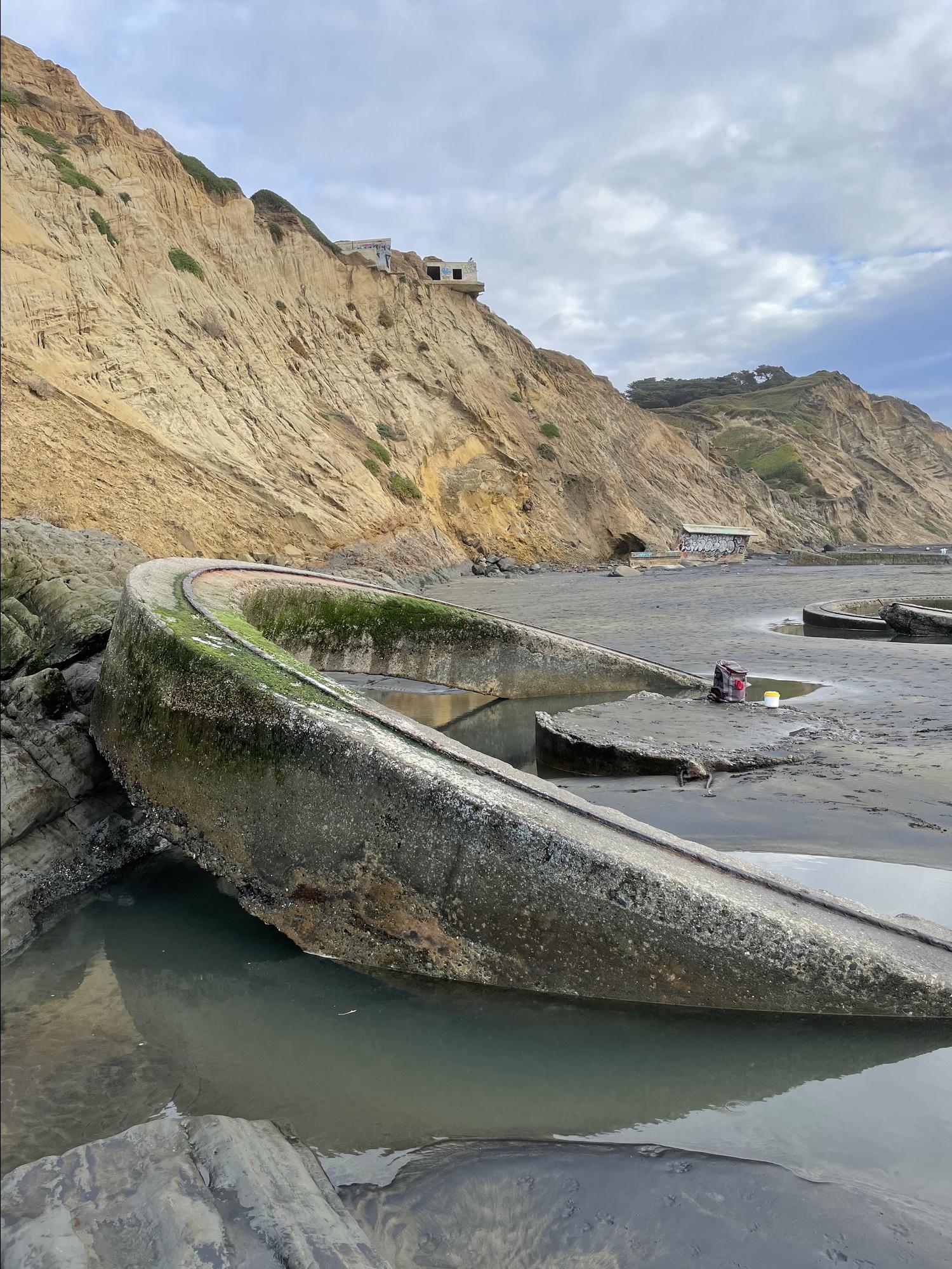 Die Befestigung war, mitsamt aufsitzender Kanone, ohne Zweifel mal ganz oben auf der Düne verankert, und ist irgendwann im Lauf der Jahre runter auf den Strand gepurzelt. Ebbe und Flut wechseln sich hier im Pazifik zweimal täglich ab und spülen jedes Mal enorme Mengen Sand herum, sodass die Plattform mal ganz versinkt, und manchmal weit aus dem Sand herausragt.