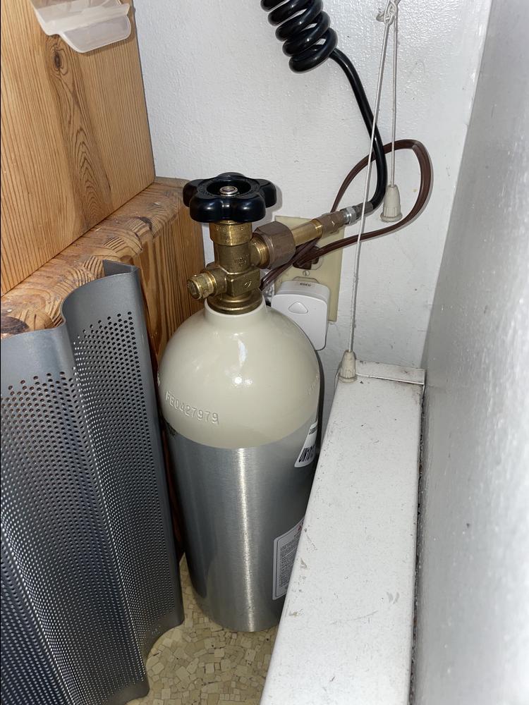 Allerdings gab es nun während der Corona-Zeit Engpässe bei der CO2-Herstellung, und die Läden für Schweißerbedarf verkauften keines mehr an Privatkunden. Kaum zwei Jahre später sprudelt die Produktion nun aber wieder. Also erwarb ich neulich beim Schweißerladen "Airgas" eine Gasflasche mit fünf Pfund CO2, und schloss sie ruck-zuck mit dem schon vor Corona bei Amazon gekauften Adapterkabel an. Sprudelt wie blöd! Nach meinen Berechnungen wird die Gasflasche bei unserem relativ geringen Bedarf pumpen, bis das Universum sich in einen glühenden Feuerball verwandelt, folglich werde ich nie mehr Kartuschen kaufen müssen.