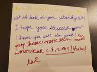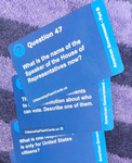 Nicht nur die Fragen sondern die Antworten sind standardisiert. Man sollte die Antworten dann auch genau so wiedergeben und nicht ausschmücken. Eine Anwärterin fiel mal durch den Test, weil sie eine Spezialistin bezüglich Martin Luther King war und dem Beamten einen langen Vortrag hielt. Der hatte aber nur die kurze Antwort "Martin Luther King" hören wollen. Es gibt dann auch alle möglichen Materialen, mit denen der Anwärter vorab üben und sich vorbereiten kann. Von klassischen vorgedruckten Karteikarten bis hin zu einer Telefon-App mit den Testfragen. Auch wenn einige Fragen leicht zu beantworten sind, wie zum Beispiel wie der Präsident der USA heißt, gibt es andere, die wir uns durchaus einzuprägen hatten, vor allen Dingen einige wichtige Jahreszahlen, wie zum Beispiel wann die amerikanische Verfassung niedergeschrieben wurde. Wochen vor dem Interview fragten wir uns gegenseitig immer wieder mit Hilfe der Karteikarten ab, oder übten mit der App. Hier sind die Fragen, die ich beantworten musste. Na, hättet ihr die Antworten gewusst?
