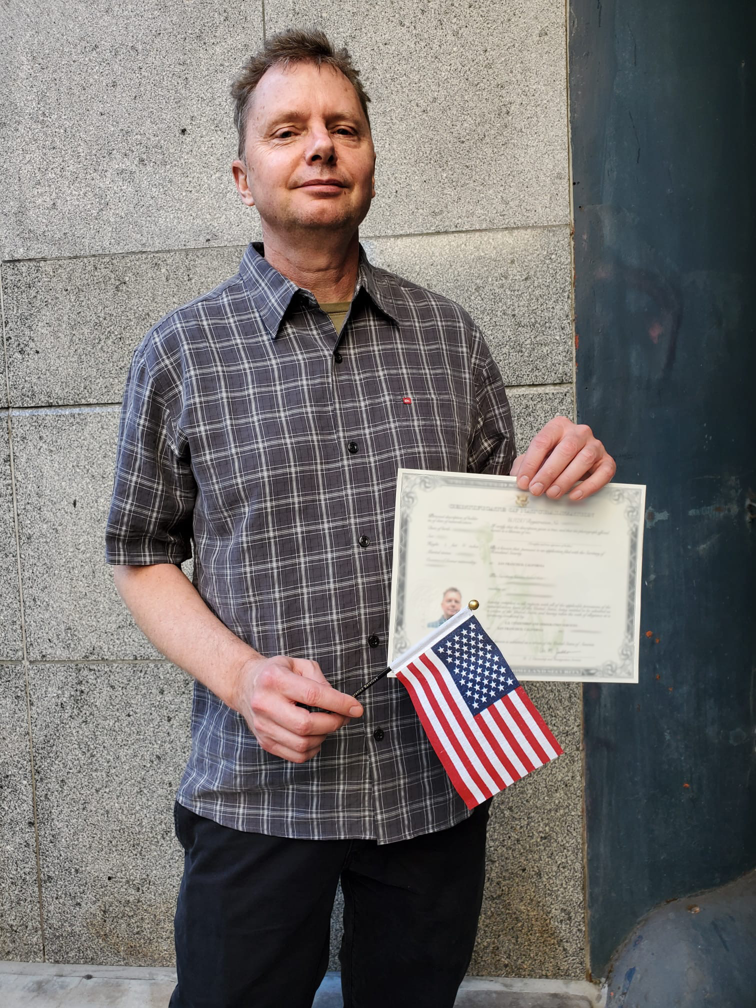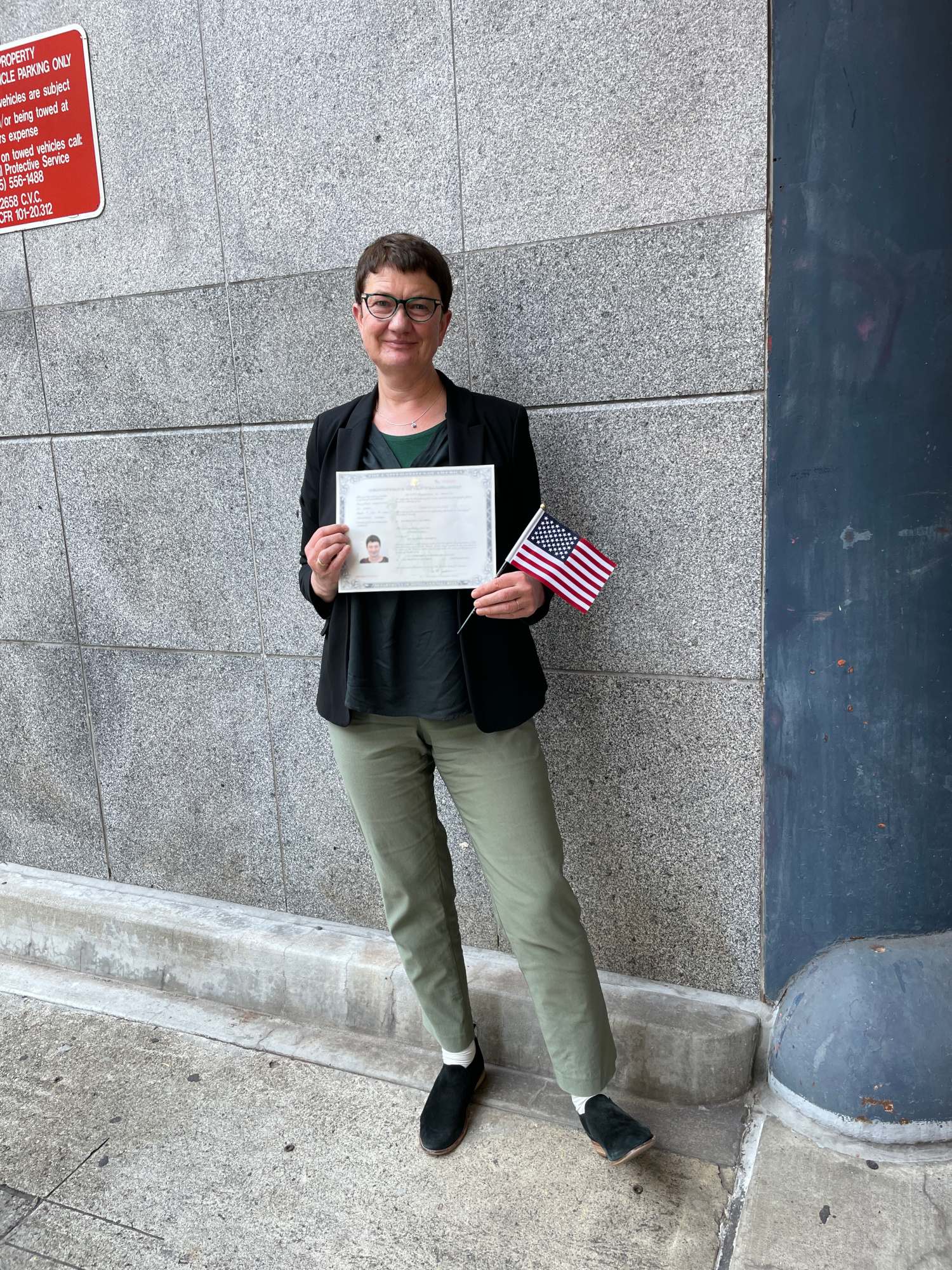 Alle Teilnehmer trugen Maske und zwischen uns waren immer zwei Stühle frei, um den Covidsicherheitsabstand einzuhalten. Die Zeremonie leitete bei mir die Chefin (Robin Barrett) der Einwanderungsbehörde in San Francisco, was wohl eher Zufall war. Es gab ein paar ermunternde Worte von ihr, so nach dem Motto, dass der Rahmen zwar nicht richtig festlich ist, das Ereignis aber trotzdem bedeutsam und wichtig. Dann erinnerte sie uns noch daran, ja auf unserer Einbürgerungsurkunde zu überprüfen, ob unser Name und das Geburtsdatum stimmten, denn wenn wir erst mit der Urkunde abzögen wäre es ein ewiges Gefrett und kostspielig, Fehler zu korrigieren. Auf der Urkunde sind neben dem vollen Namen, dem Geburtsdatum, einem Lichtbild, dem Geschlecht, der Körpergröße und dem Status ob man ledig oder verheiratet ist, noch die sogenannte "Alien Registration Number", die schon auf der Greencard stand, vermerkt. Auch muss man die Urkunde unterschreiben.