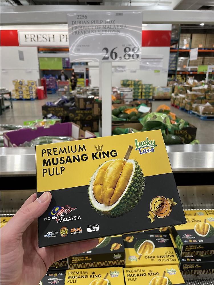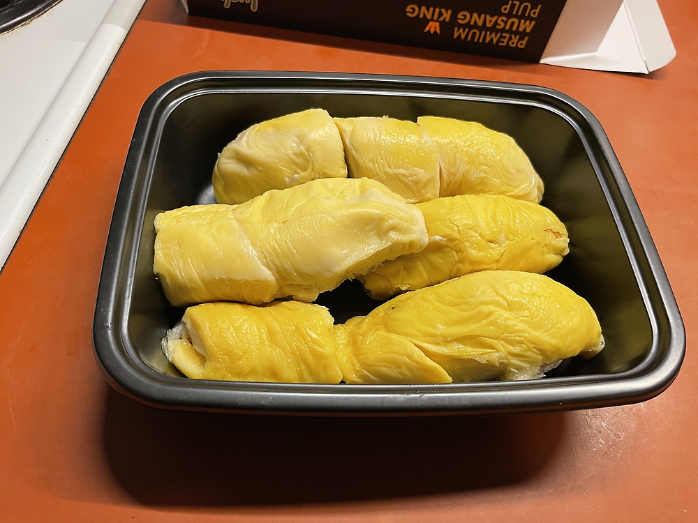 Nun begab es sich, dass unser Megasupermarkt Costco eines Tages das bereits aus der Riesenfrucht extrahierte und eingefrorene Mark zum Schlagerpreis von 27 Dollar pro 400g anbot. Da musste ich natürlich zuschlagen. Todesmutig probierte ich die frisch aufgetaut mangoartig in der Packung liegenden Stücke. Den Geruch von vermodernden Zwiebeln muss man dabei natürlich ausblenden, und man kann die Frucht auch nicht im Kühlschrank aufheben ohne die ganze Wohnung zuzustinken, selbst durch doppelte Plastiktüten bahnt der Gestank sich seinen Weg. Der Geschmack ist ... interessant. Sicher mangoartig, aber auch nussig, und auch noch mit einem benzinartigen Einschlag, sodass man nicht weiß, ob sie wirklich gut mit dem Verdauungstrakt harmoniert. Und in der Tat wälzte ich mich nach dem Genuss der Frucht des nachts etwas hin und her. Auch Angelika probierte ein Stück, hielt sich aber beim Nachschlag auffallend zurück. Fazit: Probieren sollte man's, aber eine gute reife Mango ist mir ehrlich gesagt lieber.