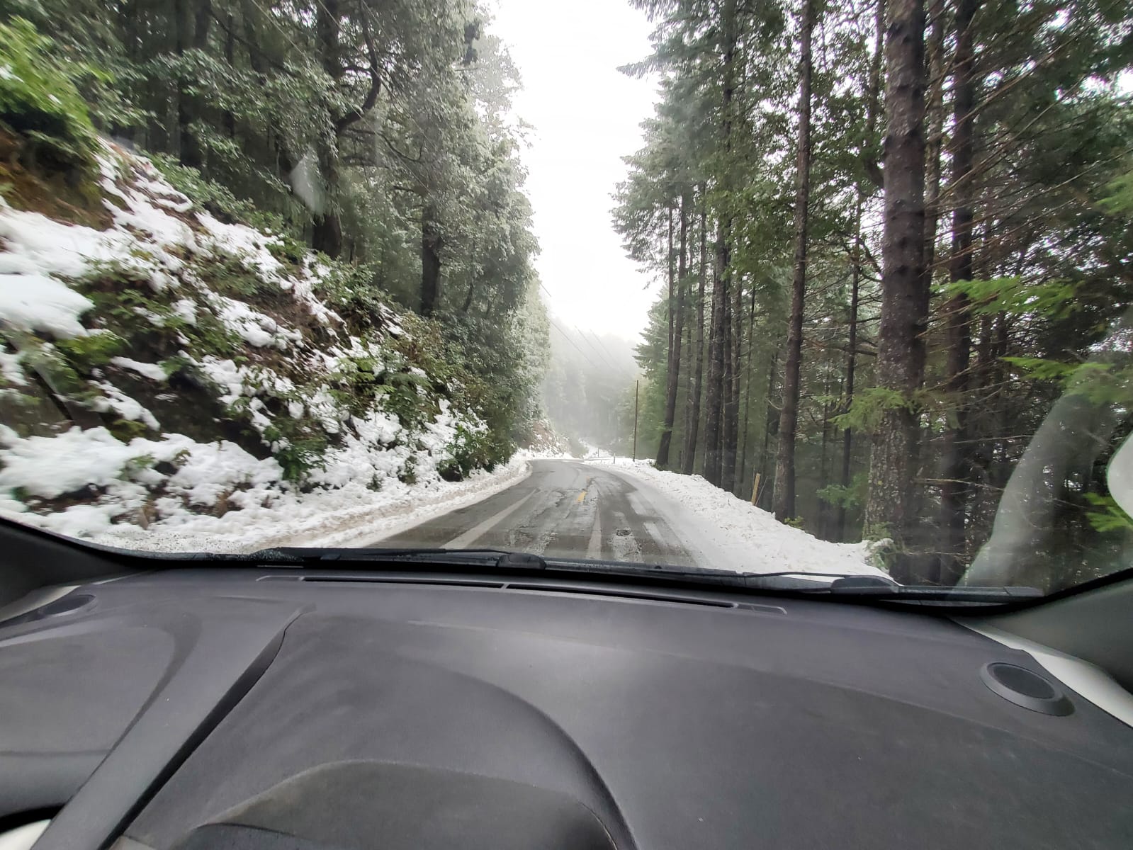 Am Sonntagmorgen tat sich dann für uns ein günstiges Zeitfenster auf, das Wetter hatte aufgeklart, Google hatte die Strecke auf dem 101 mit einer kleinen Umleitung freigegeben, und mutige Fahrer berichteten, dass auch der Pass raus aus Shelter Cove und rüber über den Hügel trotz einiger umgefallener Bäume und eisiger Stellen passierbar war. Jetzt oder nie, dachten wir, fuhren los, und es war dann ganz passabel. Ich fuhr unseren Honda Fit mit Sommerreifen langsam über die paar eisigen Stellen oben auf dem Pass und hielt zweimal rechts an, um Pickup-Trucks mit Ballonreifen vorbeizuwinken und durchbrettern zu lassen. Wie sich die Leser denken können, hätte ich solche Fahrzeuge unter normalen Bedingungen natürlich gnadenlos geschnupft aber das waren keine normalen Bedingungen!